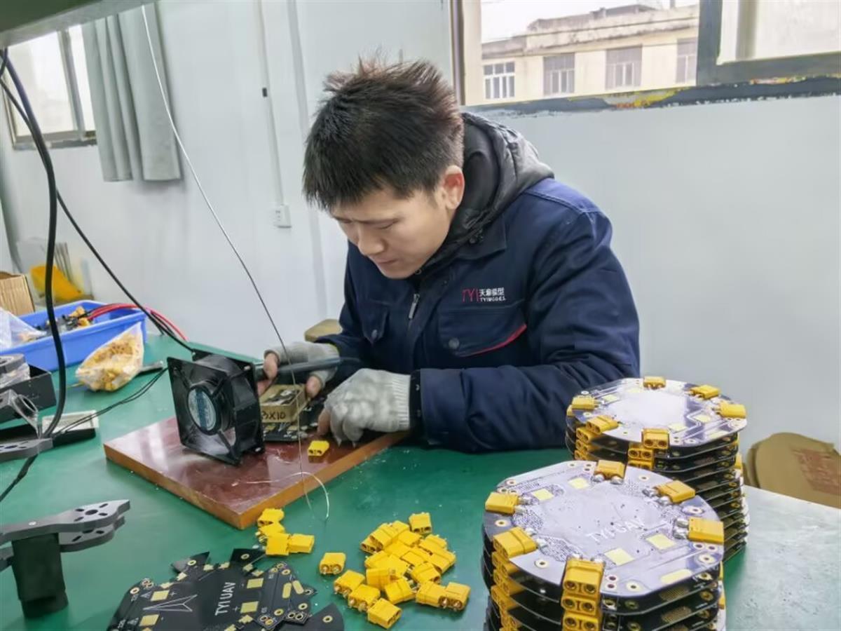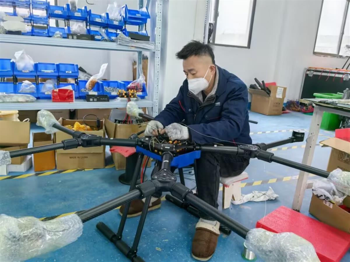 在新搬迁的天意模型科技有限公司生产车间,部分厂房和办公楼装修还未结束,30多名工人就已投入到赶制100余台农业植保无人机和1500余台小型无人机订单中。