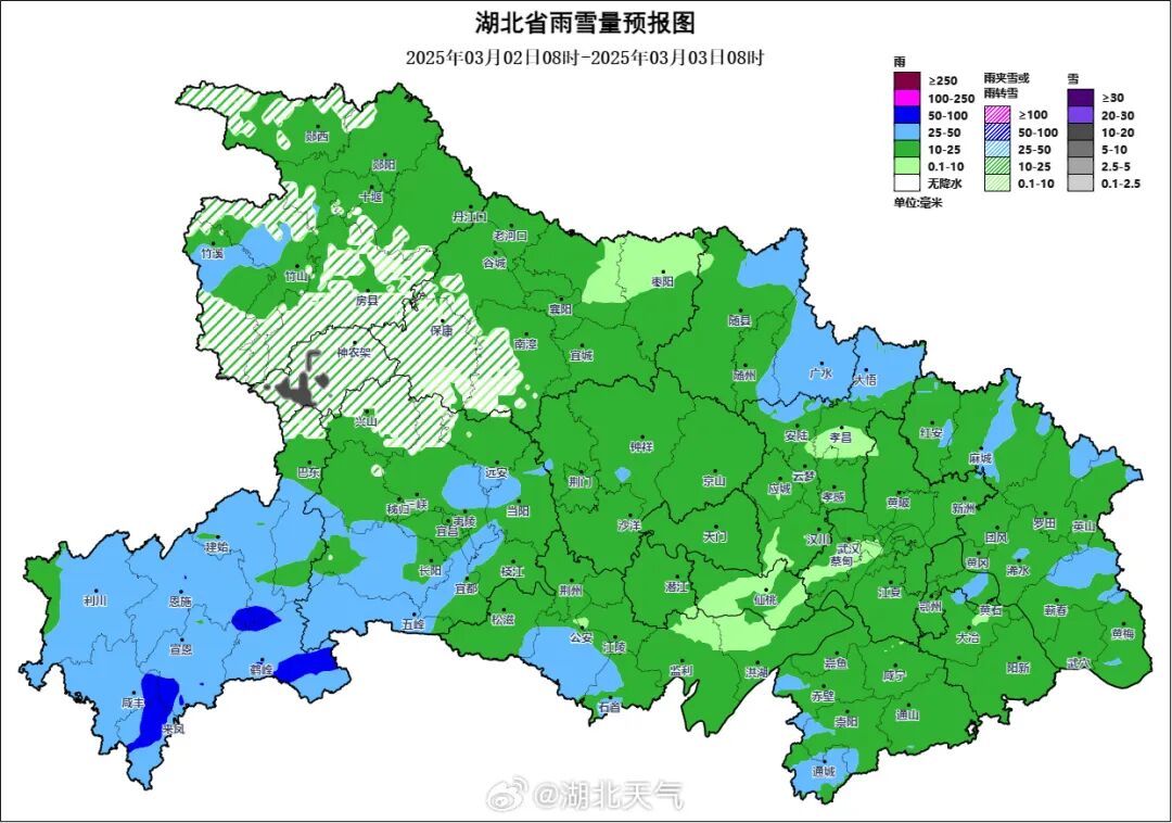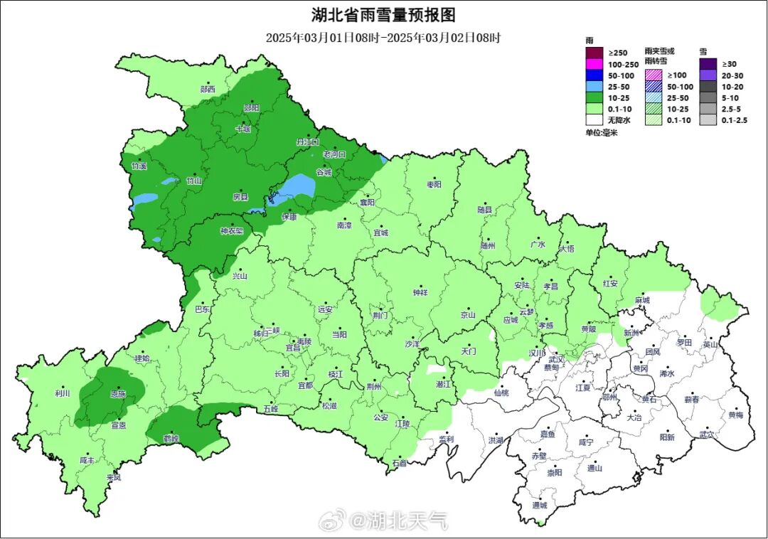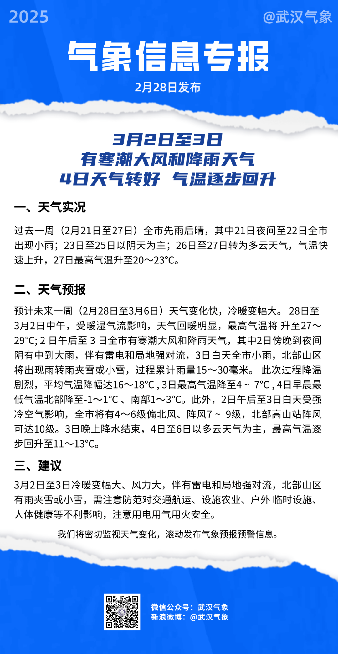 预计3月2日至3日,湖北省自西向东将有寒潮大风和雨雪天气,大部分地区平均气温下降 8~14℃,其中荆门东部、荆州东部、天门、潜江、仙桃、随州、孝感、武汉、黄冈、咸宁、鄂州、黄石等地下降15~18℃;偏北阵风7~9级、局地10级;2日晚至3日白天,北部地区有雨夹雪或雪,神农架、襄阳、随州等地有中到大雪、局地暴雪。建议加固临时搭建物、避免高空作业,防范对交通航运、设施农业、在田作物、人体健康等的不利影响。