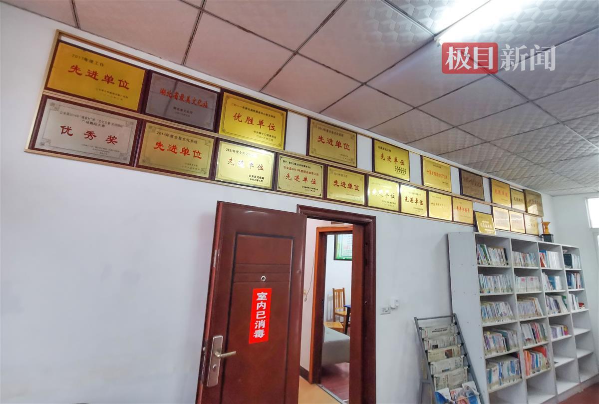 3月13日晚,在公安县狮子口文体服务中心墙壁挂满了荣誉奖牌(极目新闻记者 黄志刚 摄)