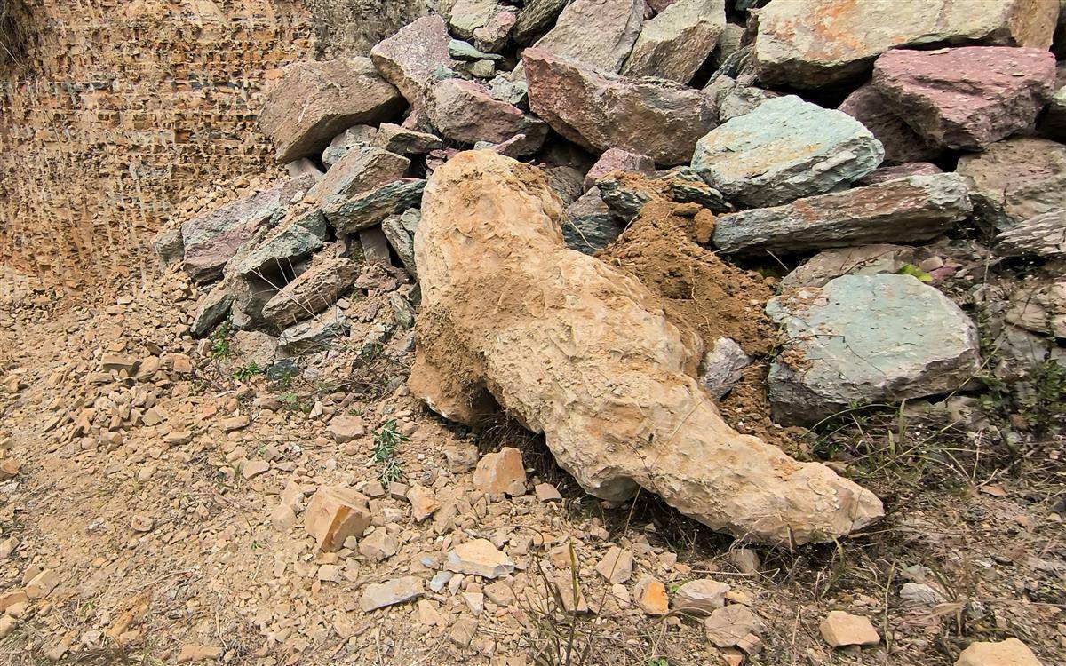 据悉,化石发现地位于楠木村村民田云奇的农场旁。3月22日,施工队正在处理农场旁的渣石,挖掘机作业时意外发现了这块造型奇特的巨石。在同一地点,施工队又于23日下午挖掘到一块形似娃娃鱼的巨石。这两块巨石除栩栩如生的造型外,石体表面一圈圈神秘的纹路尤为引人注目。