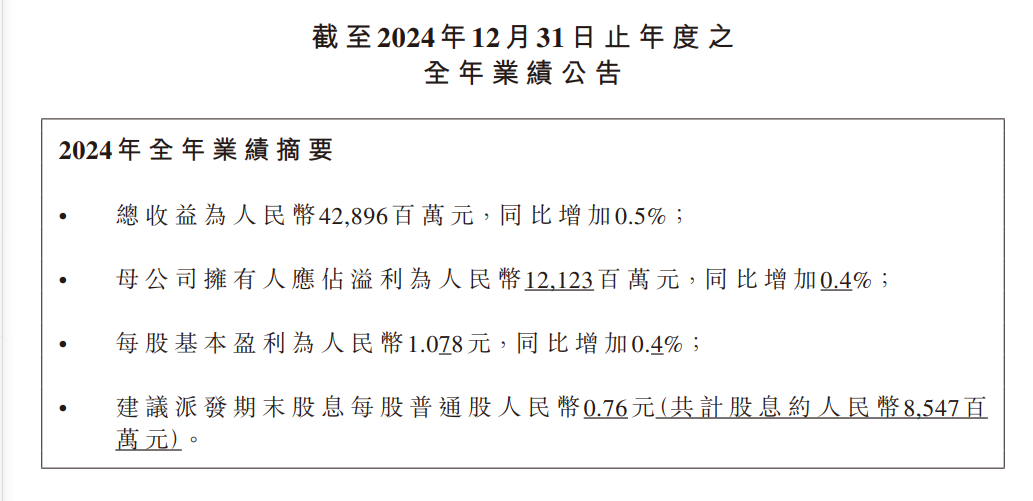 根据财报显示,2024年农夫山泉总收益为428.96亿元;公司净利润为121.23亿元;每股基本盈利为人民币1.078元;建议派发期末股息每股普通股人民币0.76元。