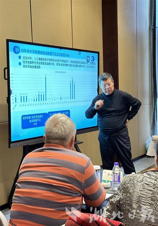 2024年11月21日,舟山市普陀区。全国科学放鱼协作机制召集水生生物保护专家、社会各界代表,共商中华鲟的海洋保护课题。危起伟应邀作了《从长江到大海拯救中华鲟方向探讨》的报告,阐述了把中华鲟保护从长江推向大海的思路。