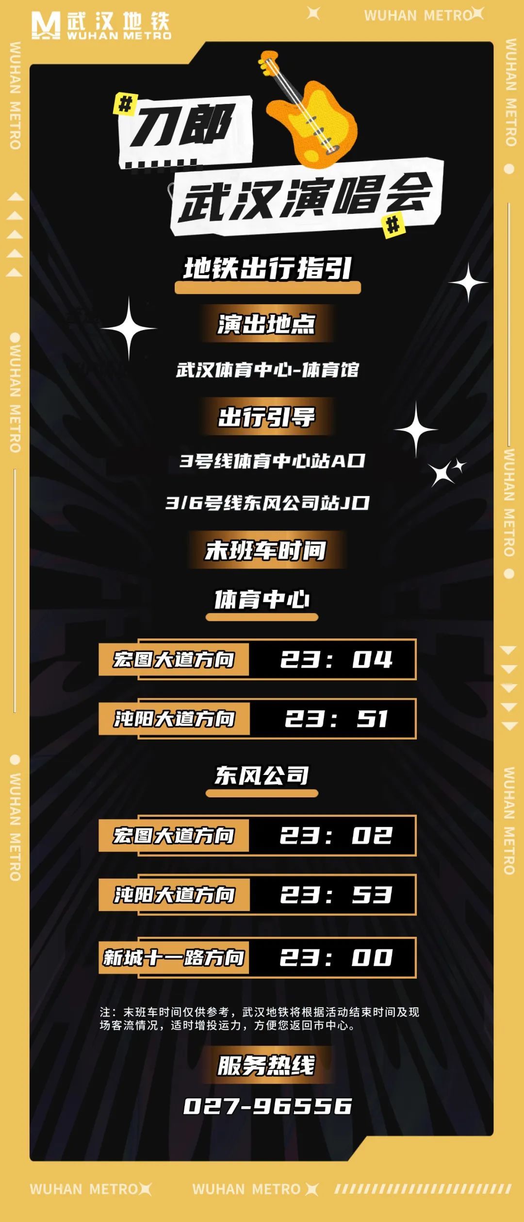 为保障广大歌迷的出行需求,武汉地铁制定专项保障方案,通过增加备用列车,增强客运现场力量,提升现场服务水平等让歌迷们往返无忧畅享音乐盛宴。