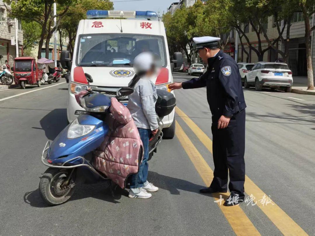 当天上午8点40分,42岁的女司机程某驾驶摩托车行驶在郧西县城富康大道时,因超越执行任务的特种车辆(救护车)的违法行为,被郧西交管大队五中队民警责令靠边停车接受检查。
