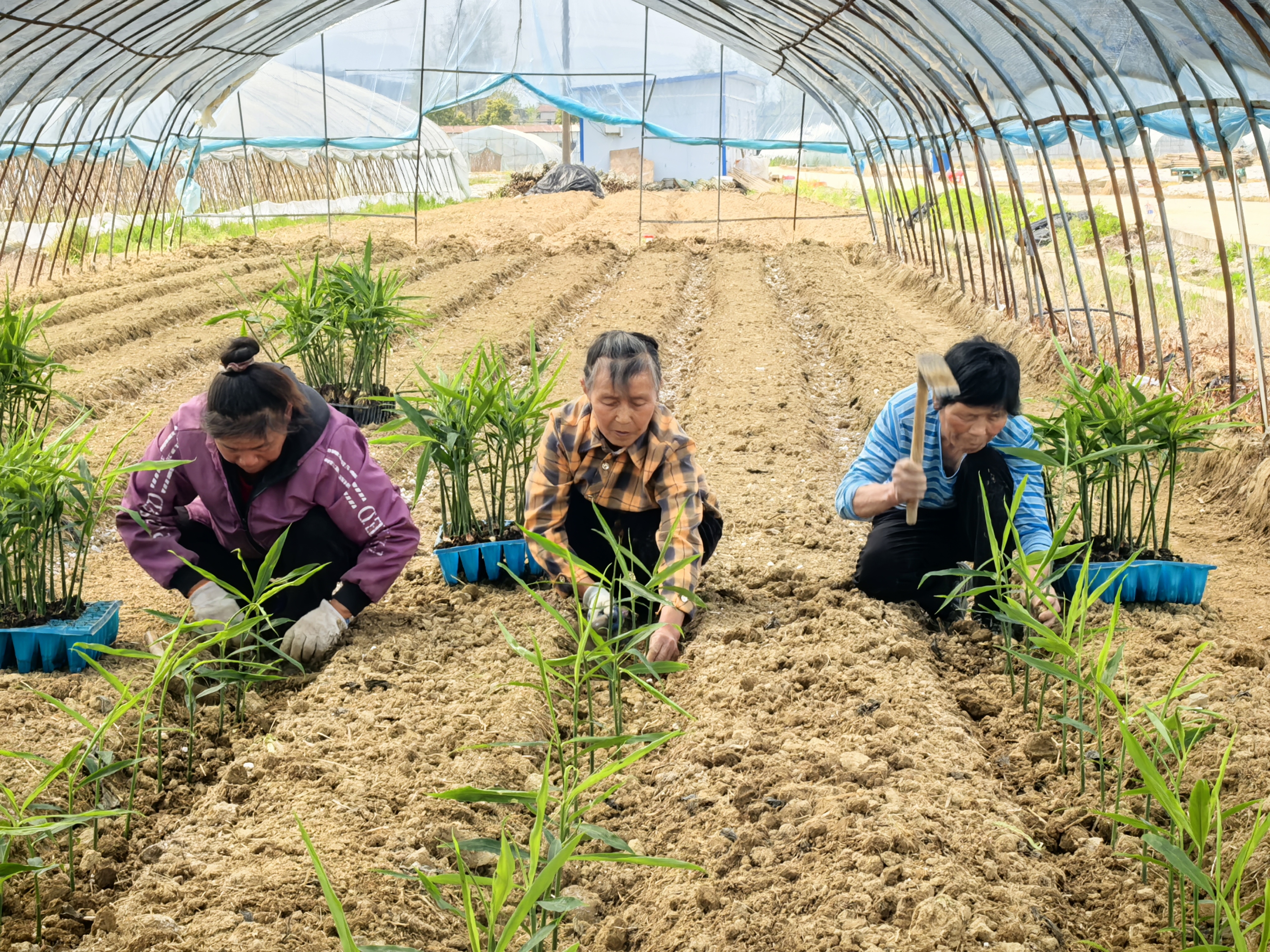 田埂边,村民们熟练地刨坑、固苗,细土在下,粗土在上……整套工作一气呵成。“往年这时候还在家闲着,现在天天来基地‘上班’,离家近,工钱还不少哩!”据了解,基地一年大概有300多名村民务工,高峰期每天有50多人“扎”在姜田。不少村民跟着学技术,回家也种起了“小姜山”。