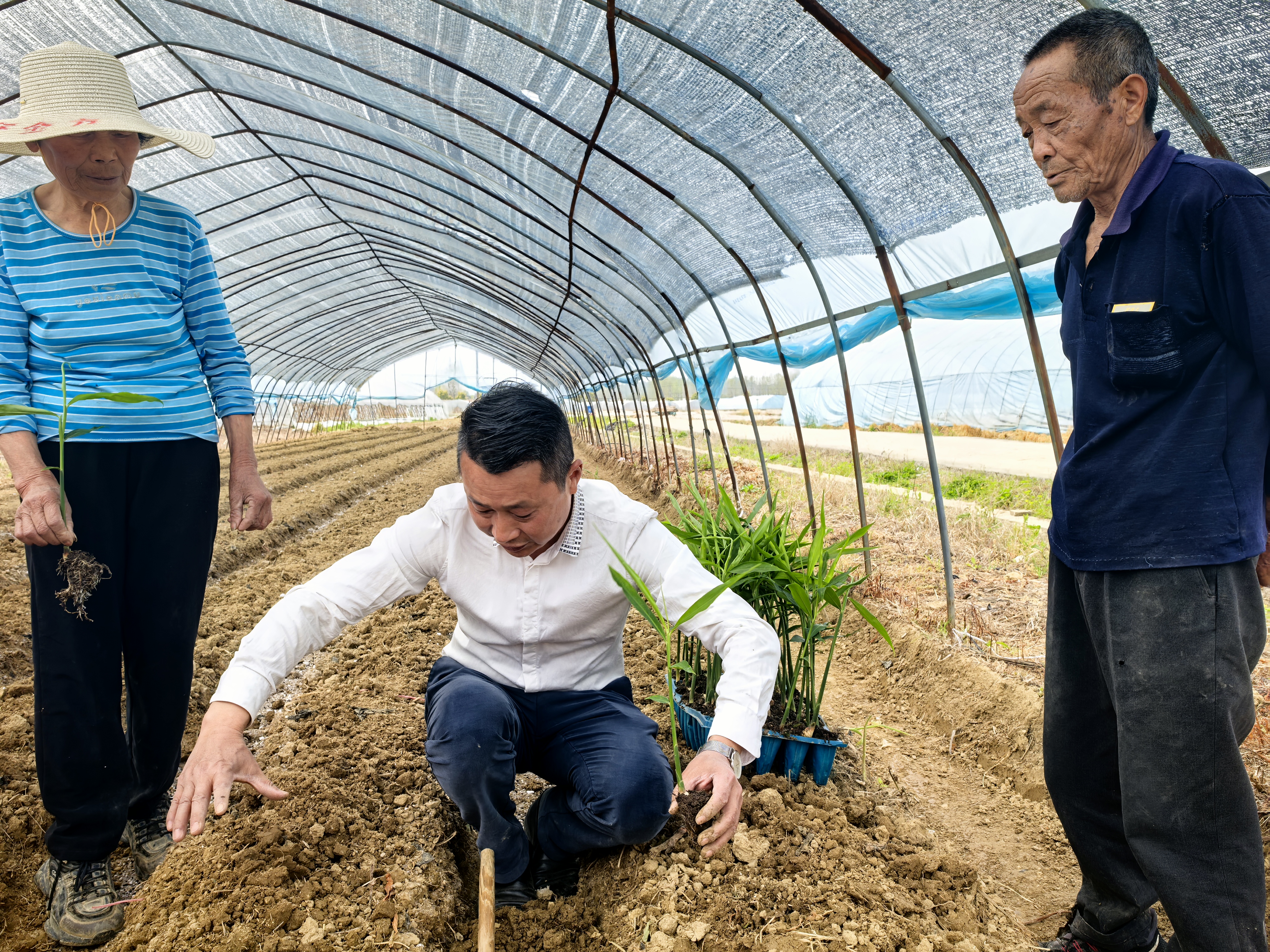 阳光下,一株株姜苗被埋入肥沃的土壤里,随风摇摆,一群村民正在地里种下新一年的希望。