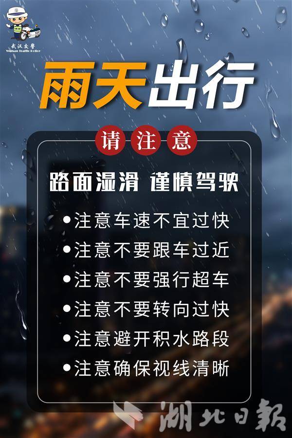 武汉交警提示:雨天行车因道路湿滑、视野受限,车辆追尾等交通事故易发、多发,强降雨影响下,部分道路如隧道、涵洞、下穿通道、施工路段等容易出现渍水情况,请广大驾驶员朋友雨天行车一定要提高警惕。武汉交警将利用全媒体渠道发布交通安全预警提示,及时发布道路通行信息、临时管控措施和绕行线路,引导市民合理出行,全力保障道路通行安全有序。