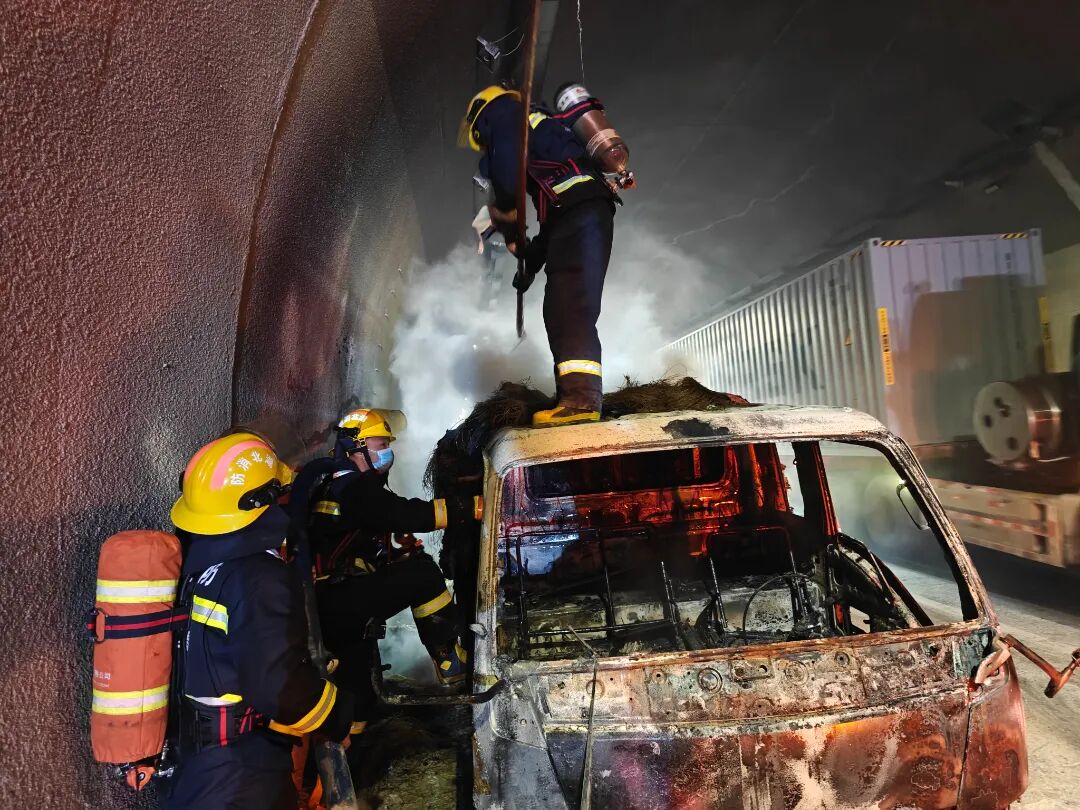 消防员对车辆进行冷却降温