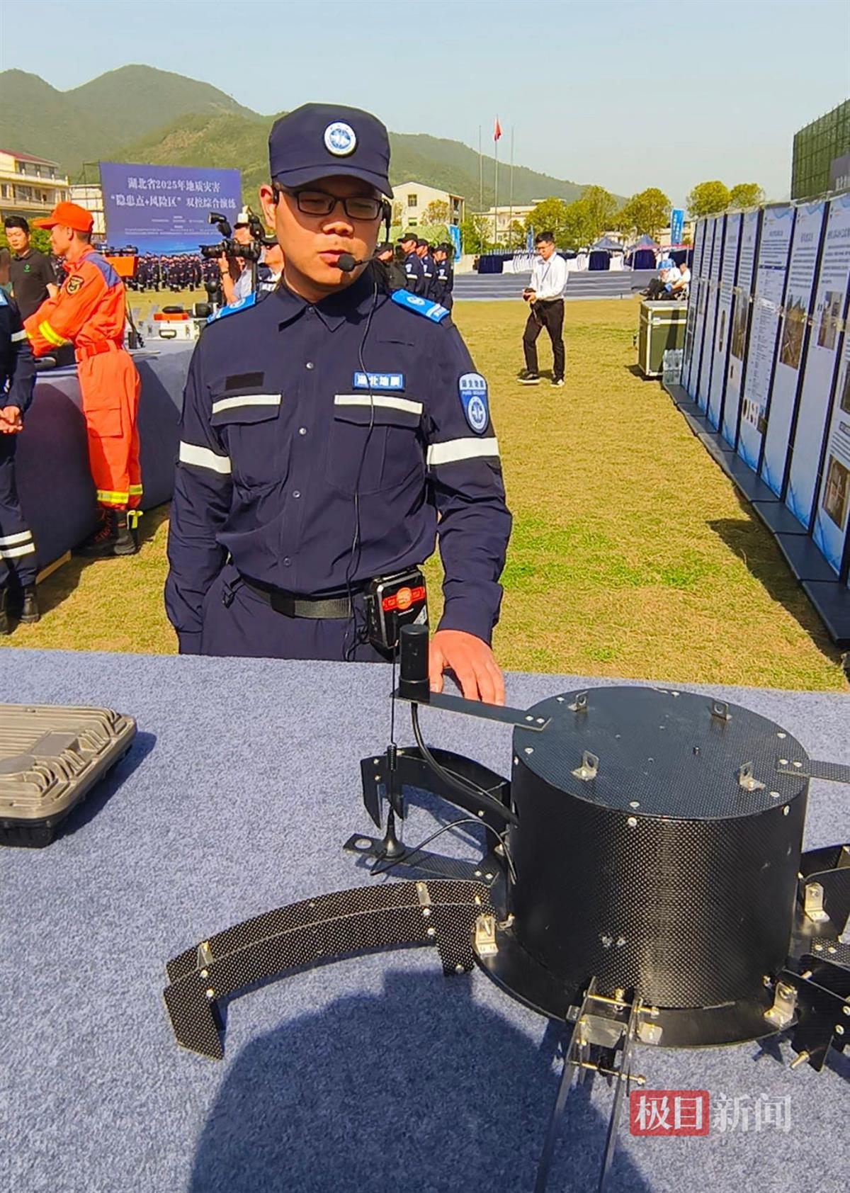演练开始前,工作人员在入口的展示区域,一一介绍用于地质灾害防治工作的装备。极目新闻记者看到,展出的有能对岩土变形进行实时监测和风险预警的有源波导声发射监测设备、AI图像分析仪,还有抛投式地表位移监测装备。