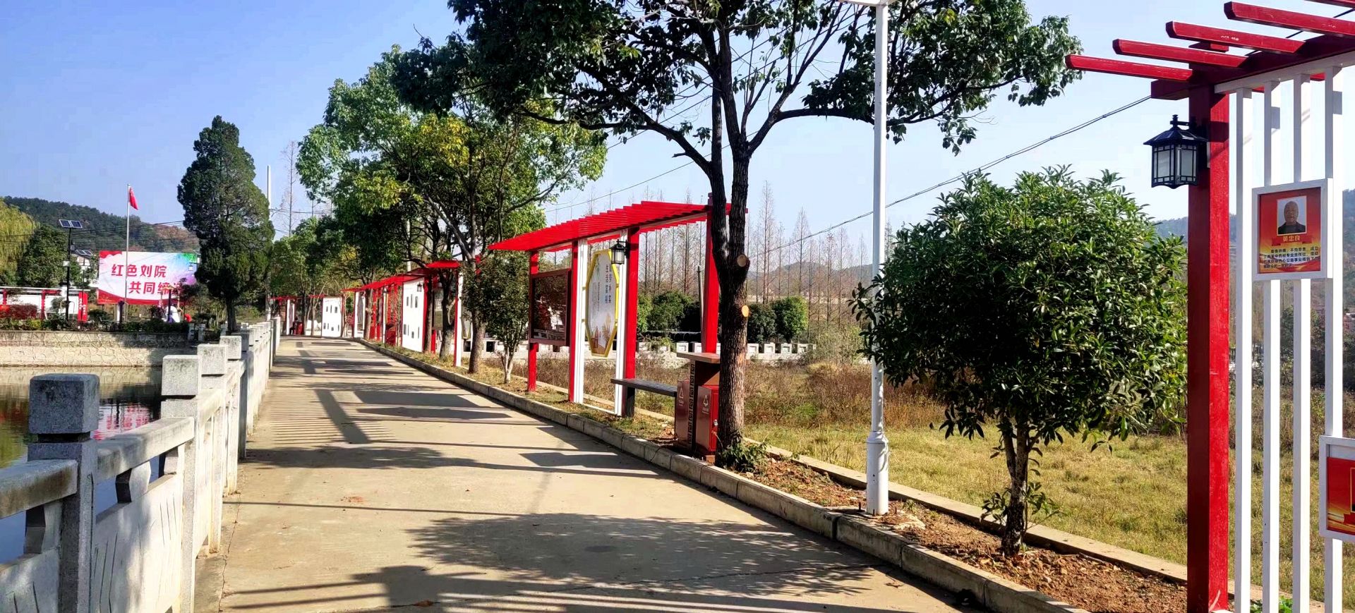 近年来,刘院村挖掘整合红色资源,结合美丽乡村建设,以刘华清纪念园为核心,打造了红色烈士陵园广场、红色文化长廊、红色教育培训中心等项目。对整村开展“硬化、美化、亮化、绿化、净化”行动,在108省道刘院路段两侧修建红色主题路灯,统一规划民居外墙布置,绘制特色墙画。