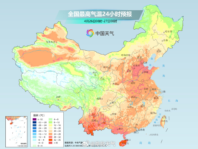 4月26日08时-27日08时,鄂西南阴天有小雨;江汉平原 南部、鄂东南多云转小雨;其他地区多云到阴天。最高气温 西部19~23℃、中东部24~28℃,最低气温14~19℃,偏东风2到3级。