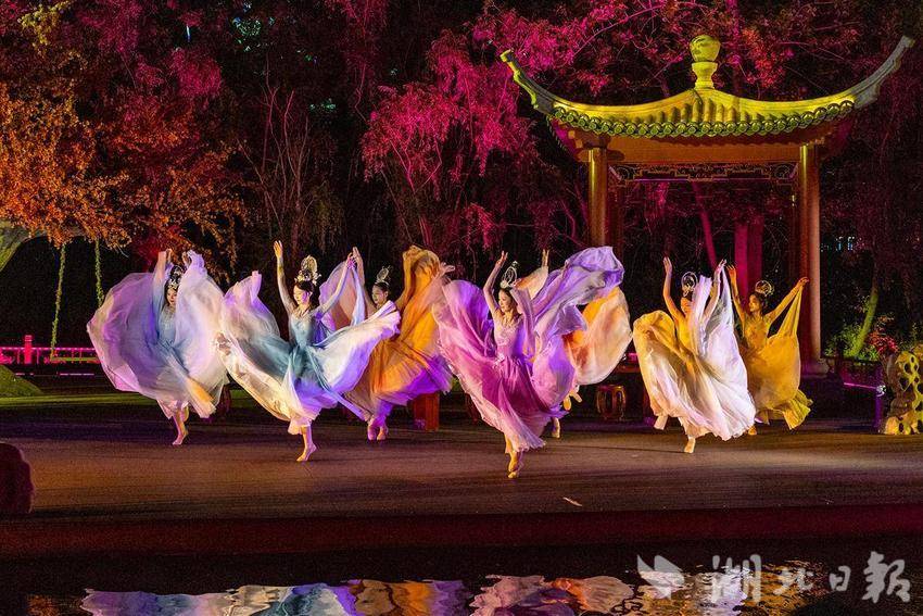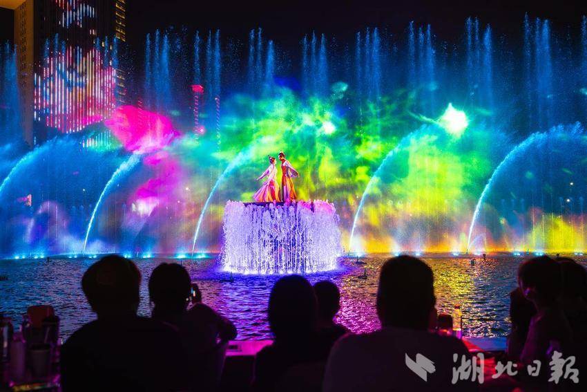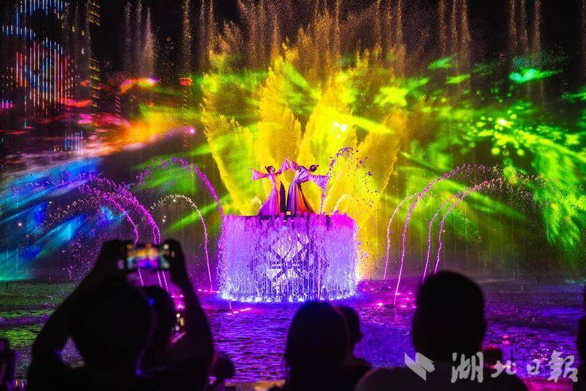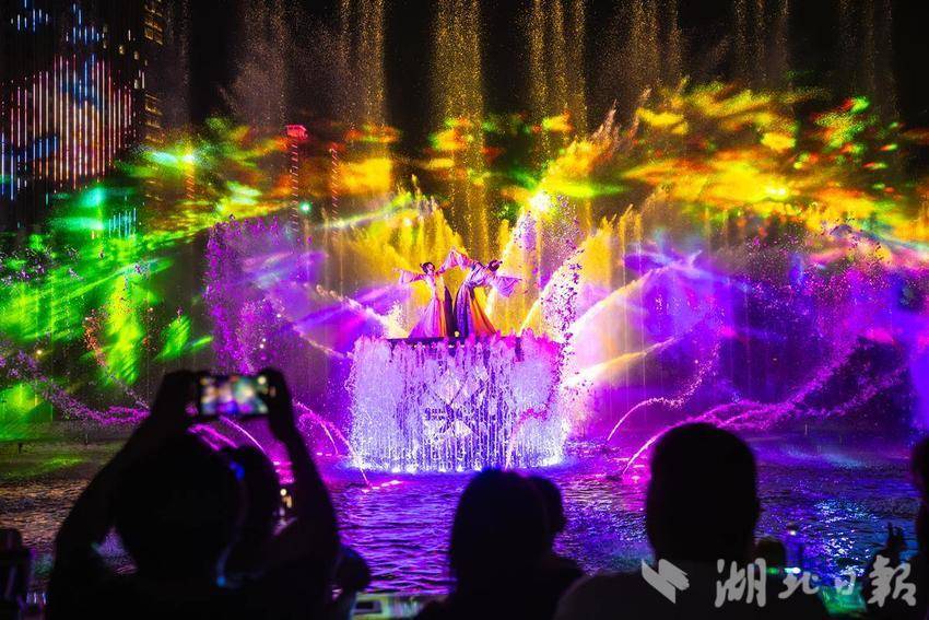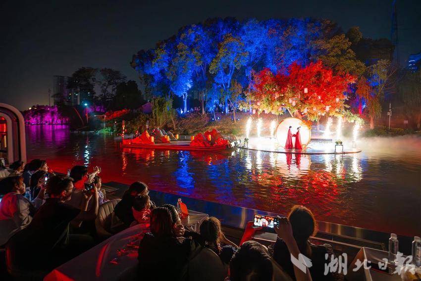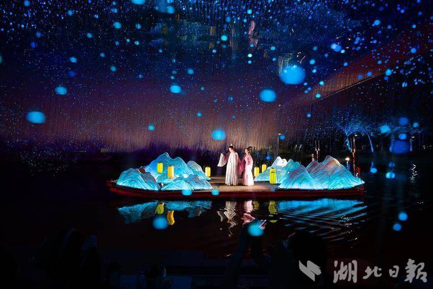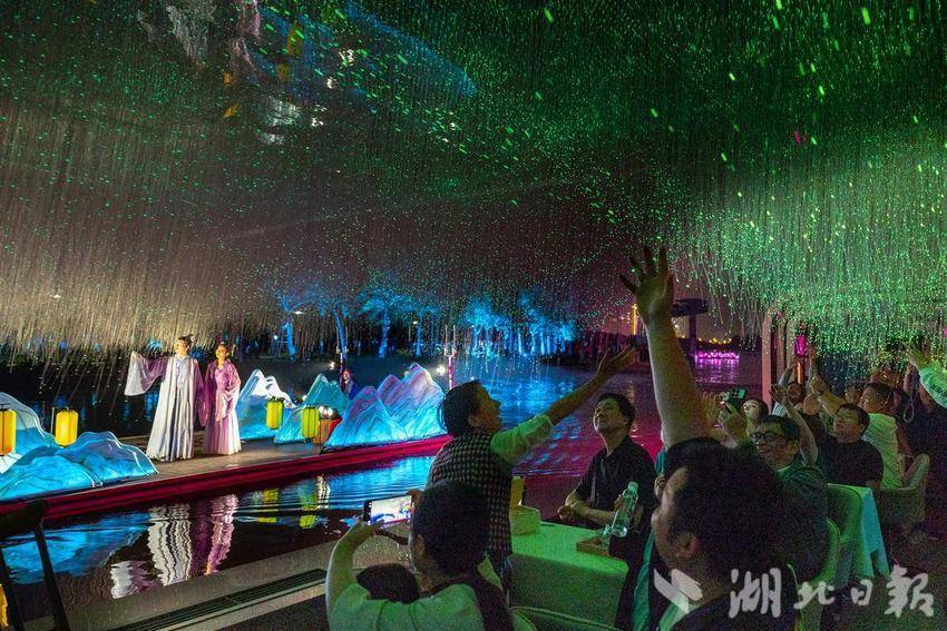 2025年4月26日,在孝感市孝南区创新文旅项目大型沉浸式水上演出《槐荫船说》正式开演。据介绍,《槐荫船说》演出以深厚的孝文化底蕴为根基,深度挖掘董永与七仙女的民间传说,创新地运用5D全息投影、智能水幕、声光联动等前沿科技,让历史传说“活”在眼前。游客们乘船穿梭于《鹊桥》《同心》等六幕场景中,在波光粼粼的槐荫河上感受时空交织的奇幻视效,360°沉浸式体验爱情传奇。(湖北日报全媒记者倪娜通讯员方倩宓天鹏摄)