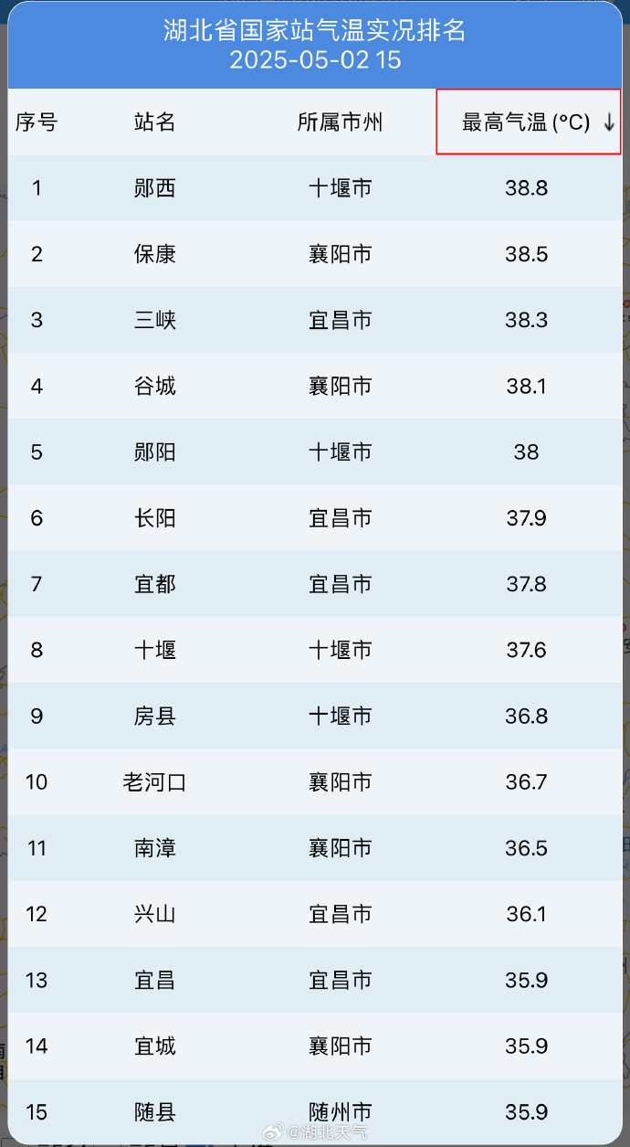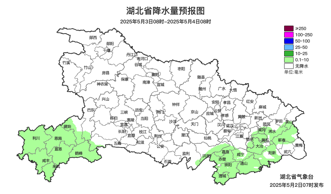 5月3日08时-4日08时,全省多云,其中鄂西南、鄂东南局地有阵雨或雷阵雨。最高气温鄂西北24~27℃、其他地区28~33℃,最低气温鄂西北13~16℃、其他地区17~20℃,偏北风3到5级、阵风6到9级,晚上转3到4级、阵风5级。5月4日08时-5日08时,江汉平原东部、鄂东北、鄂东南多云转中雨,局地大雨并伴有雷电;其他地区多云有分散性阵雨或雷阵雨。最高气温西部21~25℃、中东部25~29℃,最低气温14~19℃,偏北风3到4级、阵风5级。5月5日08时-6日08时,鄂东北东部、鄂东南小雨转多云;其他地区多云到晴天。最高气温西部30~33℃、中东部27~30℃,最低气温西部14~17℃、东部17~19℃,偏北风3到4级转偏南风2到3级。