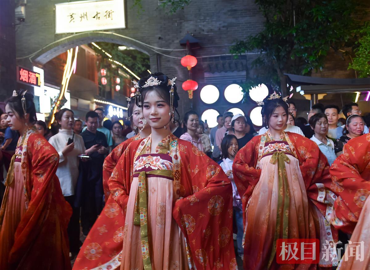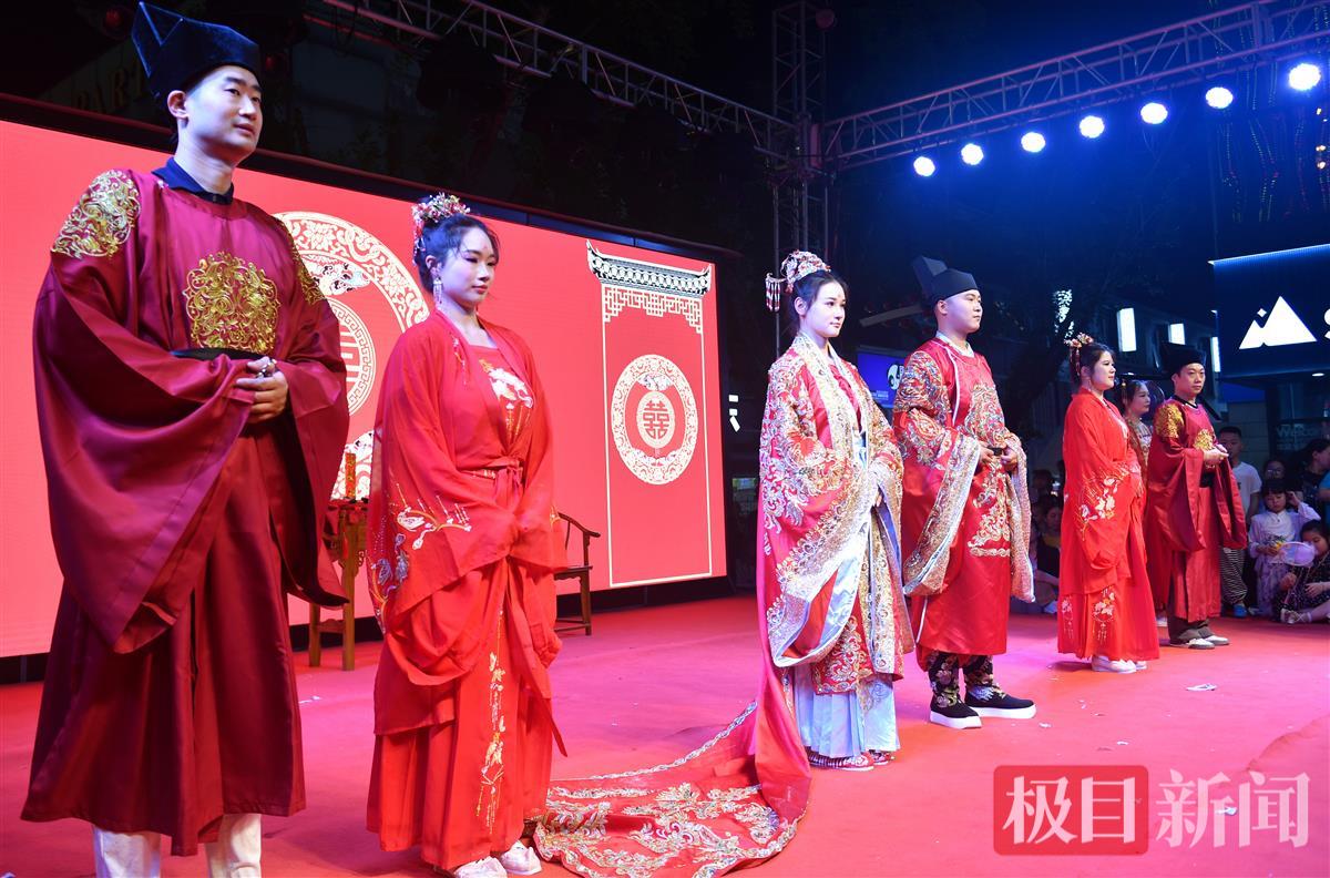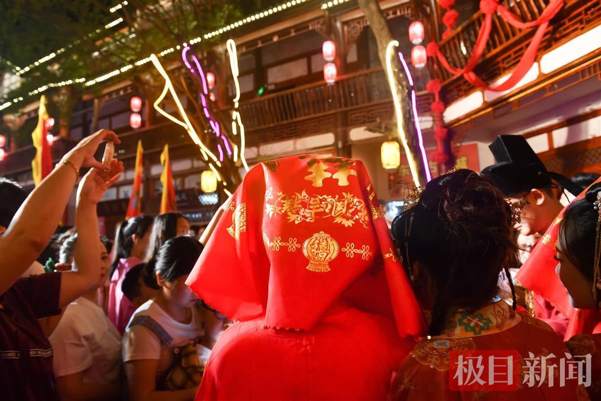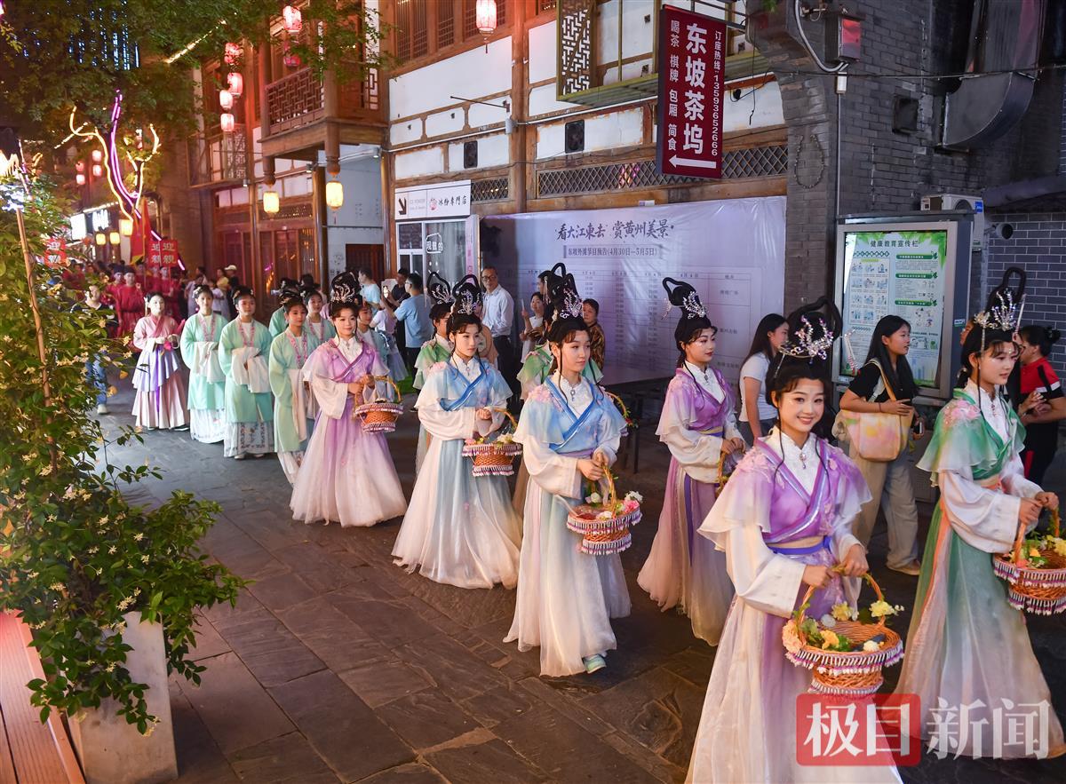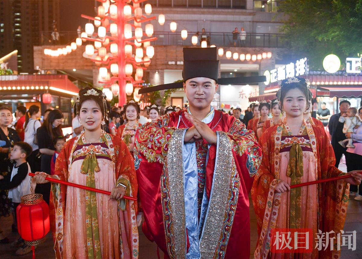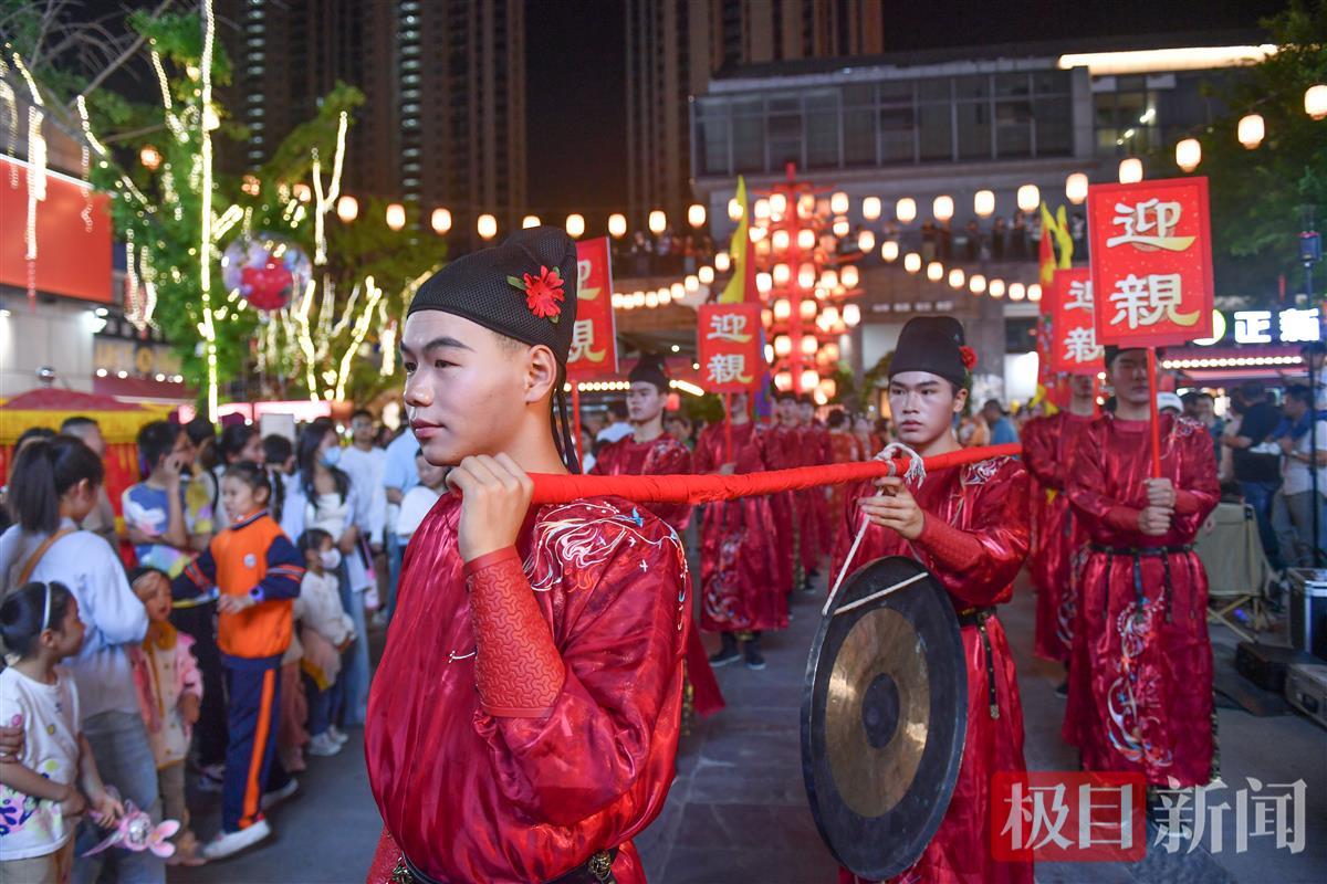 5月2日晚,一场宋式婚礼巡游在湖北黄冈东坡外滩黄州古街进行,新郎穿着宋制婚服,与迎亲队伍一起迎娶新娘,市民游客纷纷追随迎亲队伍沾喜气。宋式婚礼巡游从5月1日到5日,每天演出3场。