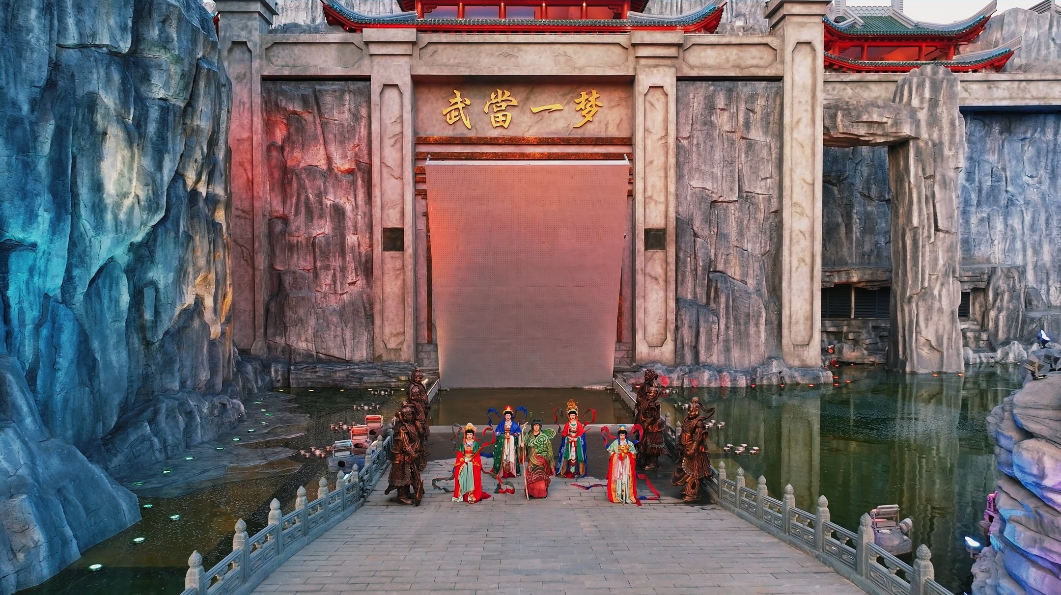 每晚7时许,园区大剧院外护城河波光潋滟,崖壁瀑布飞泻如练。随着武当山龙头香幻化的“土地公”一声号令,“六丁六甲神将”阵列天门,重达数吨的吊桥在声光特效中缓缓落下。游客们踏桥“入城”,与“神将”互动合影,仿若穿越至道家秘境。园区负责人介绍:“从踏入城门起,游客便成为故事的主角。吊桥仪式还原了古代城池礼制,结合道教的威严,配合现代声光电技术,实现‘一秒入戏’的沉浸感。”