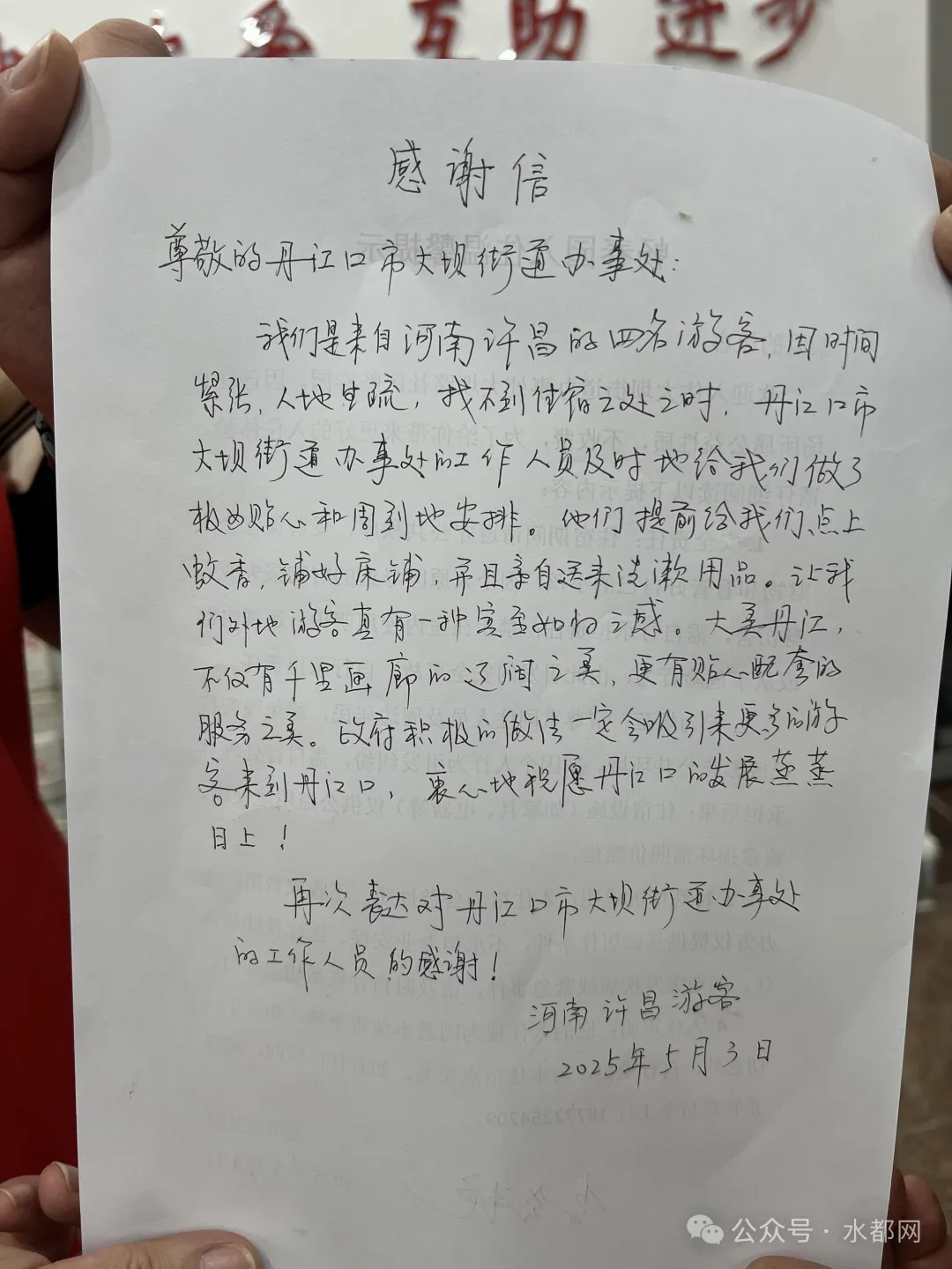 5月2日晚,河南许昌4名游客因深夜抵达时民宿满房,在景区值守志愿者迅速联系对接大坝街道办事处,调配临时住宿并配备生活用品,实现“1小时紧急安置”,被游客称为“比山水更动人的遇见”。
