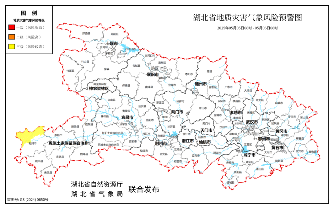 5月5日,湖北省自然资源厅、湖北省气象局联合发布湖北省地质灾害气象风险预警,2025 年 05 月 05 日 08 时-2025 年 05 月 06 日 08 时,因前期部分区域降水强度较大,预计恩施(利川市北部)发生崩塌、滑坡、泥石流的风险较高。公众需注意防范次生灾害的发生,合理安排假期返程。