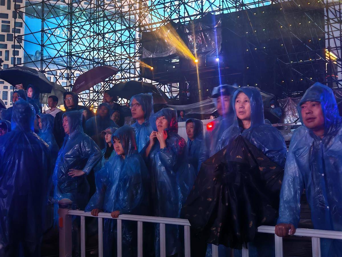 当晚,为满足“苏粉、苏迷”们的热情、缓解户外版门票一票难求的局面,主办方决定在原定演出的基础上加演一场。加演开场前,大雨滂沱,民警在入口处组成人墙引导人流,红马甲志愿者小跑着分发雨衣。