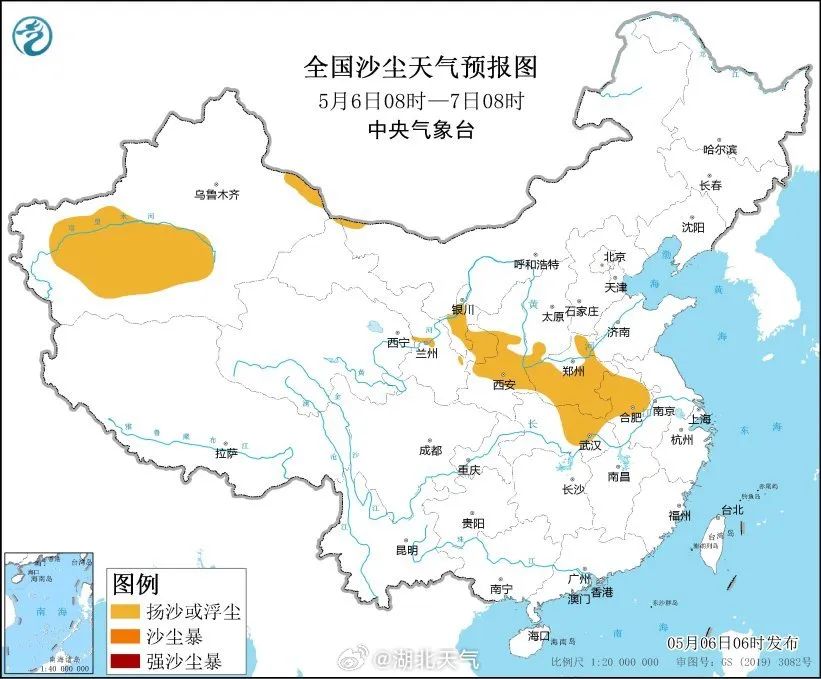 中央气象台5月6日06时继续发布沙尘暴蓝色预警:受冷空气大风影响,预计5月6日08时至7日08时,新疆南疆盆地、甘肃东部、宁夏中部、陕西中部、河南南部和西部、湖北北部、安徽北部等地的部分地区有扬沙或浮尘天气。