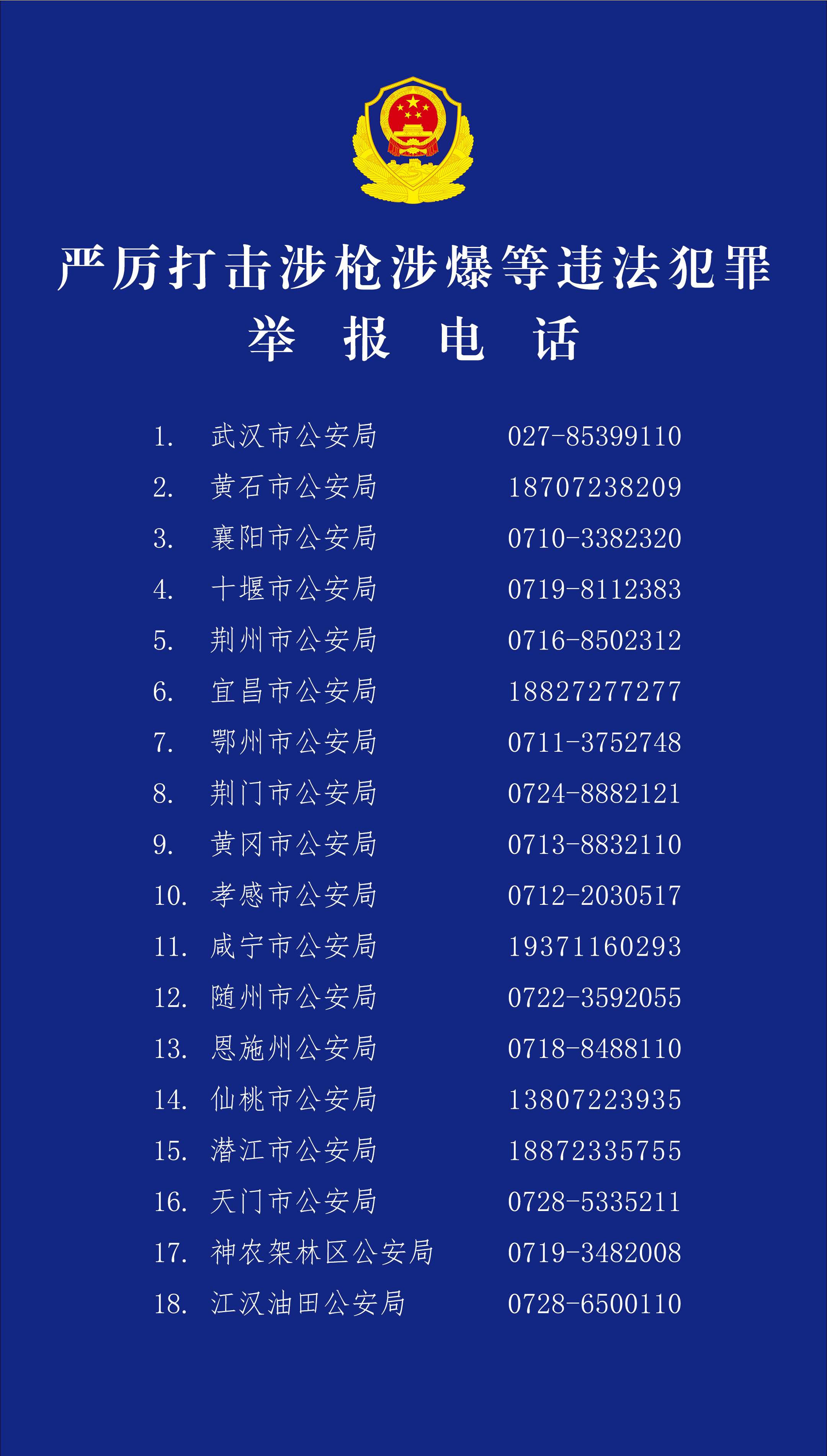 长江日报大武汉客户端5月6日讯(通讯员杨保华 陈高雄 记者夏奕)据省公安厅6日公布消息,4月29日湖北省高级人民法院、省人民检察院、省公安厅联合印发《关于依法收缴非法枪爆等物品 严厉打击涉枪涉爆等违法犯罪的通告》(以下简称《通告》),明确进一步推进全省打击整治枪爆违法犯罪专项行动,广泛发动群众参与举报涉枪爆线索,全面收缴各类非法枪支、弹药、爆炸物品、仿真枪、弩、管制刀具等物品,依法严打涉枪涉爆涉刀涉弩等违法犯罪,全力保护人民群众生命财产安全。