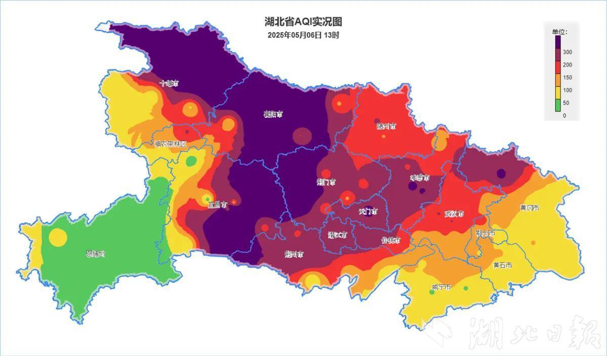据气象监测,5日全省大部以多云到晴为主,部分县市区刮起5到7级偏北阵风,最高气温达26至32°C。6日全省大部维持晴朗天气,仅恩施局地有阵雨或雷阵雨,午后鄂西北气温迅速攀升,十堰、郧西等地率先冲破30℃大关。但是,北风裹挟着远方的沙尘南下,湖北北部和中部地区出现浮尘天气,其中,13时十堰、襄阳、宜昌、荆门、孝感等地出现重污染天气,武汉地区也出现轻度和中度污染。