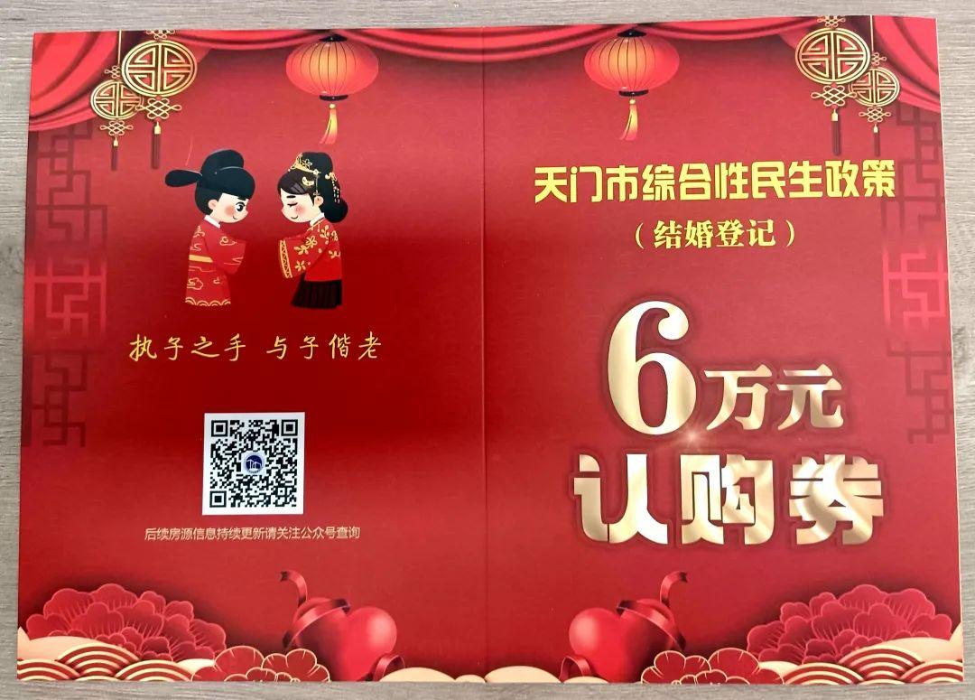 5月6日上午,小李和未婚妻来到天门市民政局婚姻登记处,领取结婚证的同时,还拿到一张6万元的购房认购券。下午,他们就来到城区某楼盘,买下一套140多平方米的新房。