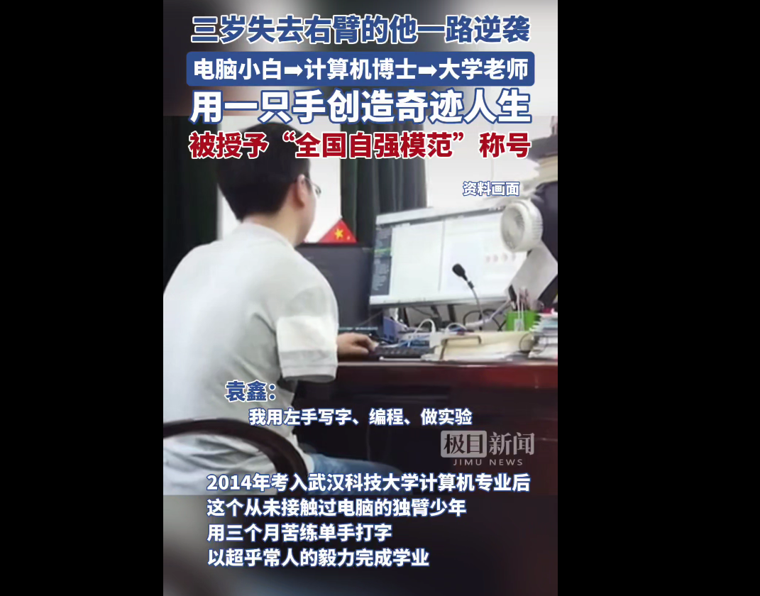 失去右臂,没有磨灭他自强的信念。靠着一只手,他做到了生活自理,从电脑小白到独臂博士,再到高校教师。95后的袁鑫,用“全国自强模范”的最新荣誉证明了他的人生格言:“我命由我不由天!”