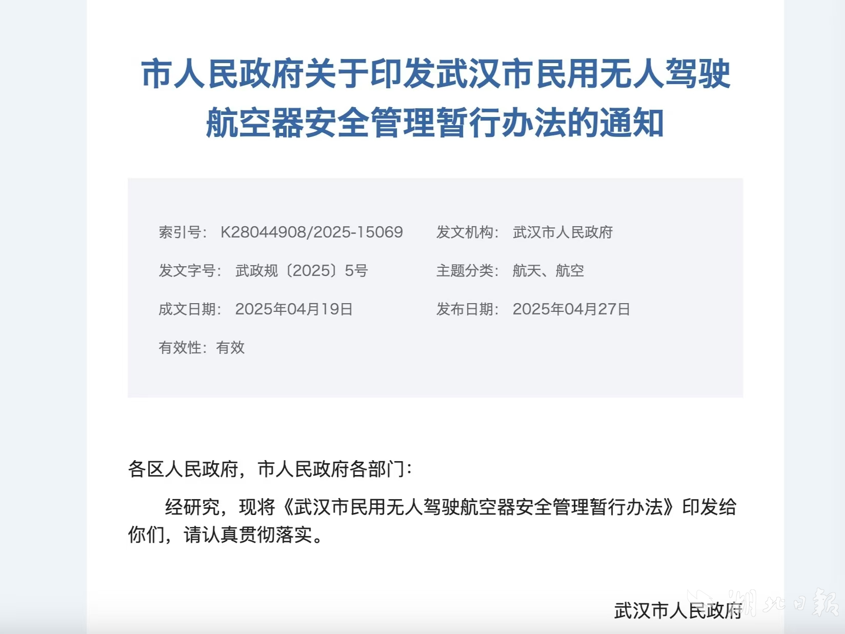 近日,《武汉市民用无人驾驶航空器安全管理暂行办法》(以下简称《办法》)正式发布,并将自2025年5月29日起施行。这是武汉市第一部民用无人驾驶航空器安全管理工作规范性文件。5月19日,武汉市公安局治安管理支队相关负责人对《办法》内容进行了解读。
