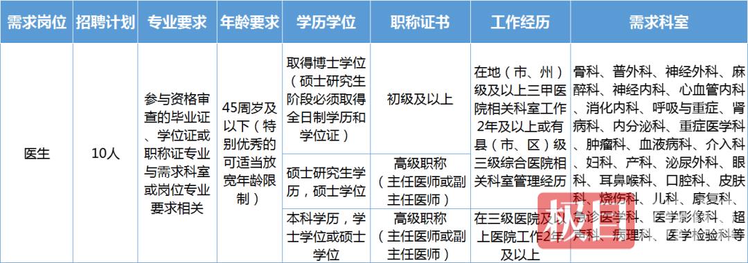 公开引进医学博士或学科带头人10名,具体详见《岗位需求表》。