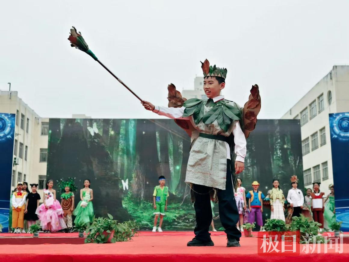 森林主题中,同学们奇思妙想,将塑料袋化作精灵翅膀,废旧纸板变为战士铠甲,荧光涂料点亮“星空蘑菇”,完美融合自然与科技;海洋主题下,矿泉水瓶幻化成娇艳花瓣,旧报纸重塑为翻涌浪花,用废弃物构建出蓝色家园的浪漫图景;未来星际主题里,充满科幻感的服饰不仅展现对宇宙的憧憬,更传递出永恒的环保使命。这些由废旧材料精心制作的服装,不仅是创意与艺术的完美结合,更是“变废为宝”的生动实践。