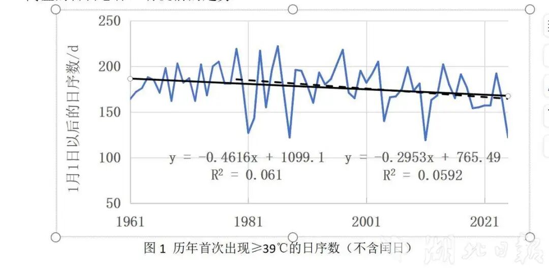 一、与近60年来气温的显著上升趋势一致,1961到2024年,湖北省年平均最高气温呈显著上升趋势,升温速率为 0.24℃/10 年;