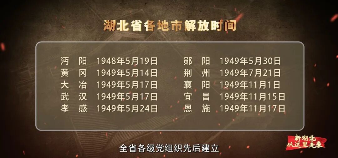 这一天,中共湖北省委、湖北省人民政府和中国人民解放军湖北军区在花园宣告成立,并将花园孙家畈确定为党政军机关驻地。自此,拉开了湖北全境解放的大幕,成为新湖北历史发展的重要转折点。