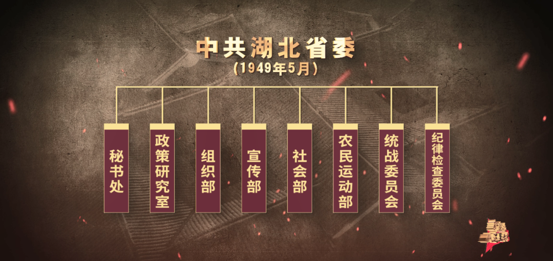 1949年5月16日,汉口解放。17日,汉阳、武昌相继解放。在省委领导紧锣密鼓地筹备组建省委省政府和湖北军区的同时,省委派人打前站,先期抵达武昌,接管国民党政府机构。王宏坤、王任重等其他领导干部陆续抵达武昌,组织领导政权接管、维护社会稳定、恢复发展生产、战阵勤务等工作。
