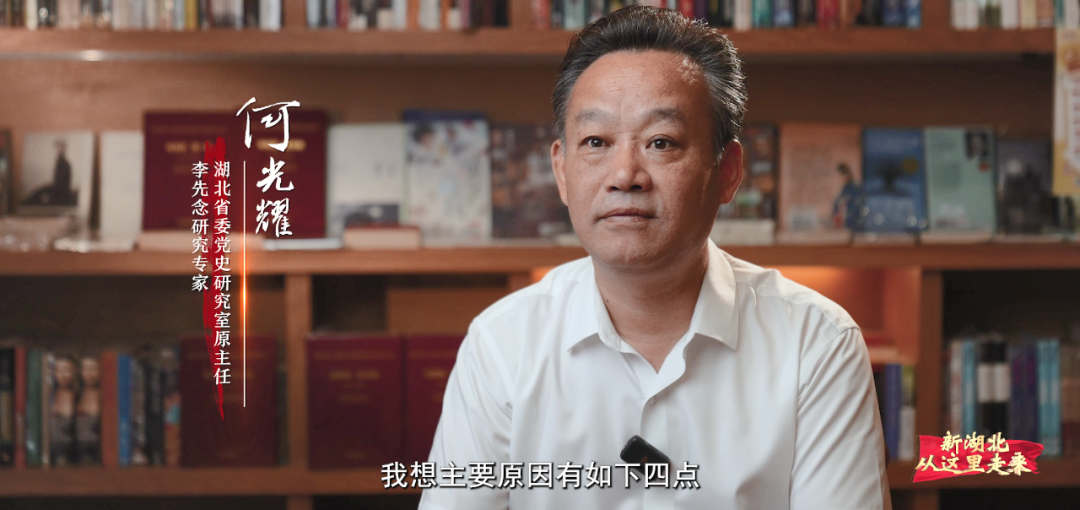 湖北省委党史研究室原主任、李先念研究专家 何光耀:党中央、毛主席决定李先念同志主政湖北,我想主要原因有如下四点:第一是李先念同志政治坚定;第二点是情况熟悉,因为李先念是湖北人,在湖北土生土长,在革命战争年代,他长期在湖北地区战斗,对湖北的情况十分了解;第三就是善于开拓,李先念同志的一个突出特点,就是善于在艰难困苦的环境中打开局面;最后一个原因,就是李先念同志注重团结。