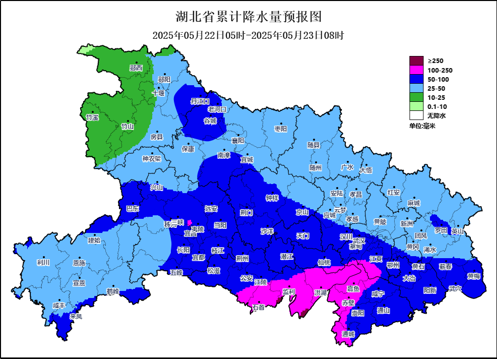 因水汽输送加强和低涡影响,预计5月22日湖北省将有大范围大雨到暴雨,并伴有短时强降水(最大雨强40~80毫米)、雷暴大风(8~11级)、冰雹等强对流天气,其中荆州、仙桃、武汉南部、咸宁局地大暴雨,单点特大暴雨;大部分地区累计雨量30~80毫米,江汉平原南部和鄂东南局地100~180毫米、单点220毫米以上。此次过程降雨强度大,且前期干旱少雨,旱涝急转风险大,致灾风险高。