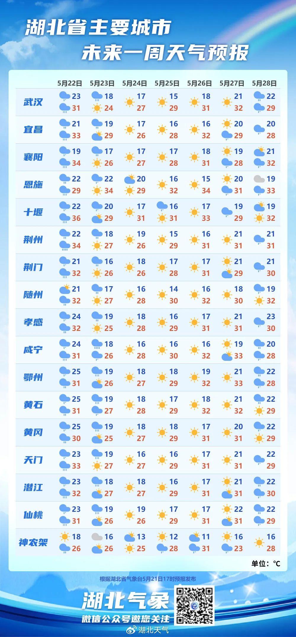后天全省多云到晴天,夜间鄂西北局地有阵雨或雷阵雨。最高气温十堰29~31℃,其他地区25~29℃.