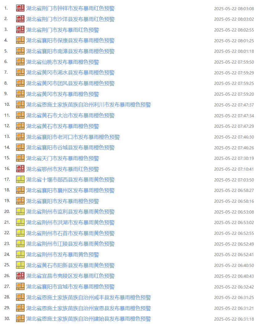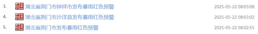 5月22日8时2分,荆门市气象台升级发布暴雨红色预警信号:过去3小时钟祥文集镇、郢中街道,沙洋马良镇降雨量已达80-90毫米。预计未来3小时,上述地区降水仍将持续,将出现大暴雨,累计雨量可达100-150毫米,并伴有雷暴大风,地质灾害、中小河流、城乡积涝风险极高,请特别加强防范。