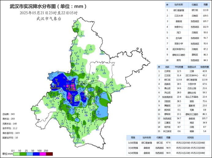 【天气实况】过去6小时,中心城区、东西湖、蔡甸、经开、江夏出现雷阵雨,其中有4站超过100毫米,最大累计雨量和最大小时雨强均出现在硚口区易家墩站,分别为113.8毫米和67.6毫米(22日3时—4时),最大阵风为江夏区金口三湖站20.6m/s(8级,22日1时13分)。