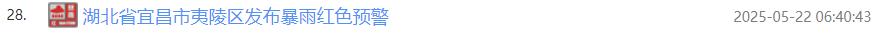 5月22日6时40分,宜昌市夷陵区气象台升级发布暴雨红色预警信号:过去1小时夷陵区黄花镇已经出现60毫米以上降雨,受强降雨云团持续影响,预计未来2小时,夷陵区分乡镇、黄花镇累计雨量将达100毫米以上,小时雨强50到80毫米,伴有雷电、短时强降雨、阵风4到6级,城乡积涝、地质灾害、中小河流洪水风险极高,请加强防范。