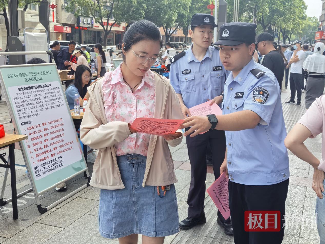 针对“求职季”诈骗高发态势,西城派出所民警走进曾都区“民营企业服务月”招聘会,为求职者送上“反诈防骗第一课”。活动现场,民辅警通过发放《求职防骗指南》宣传手册、剖析“虚假招聘”“高薪陷阱”等典型案例,揭露“入职缴费”“假老乡诱骗”等常见诈骗套路。