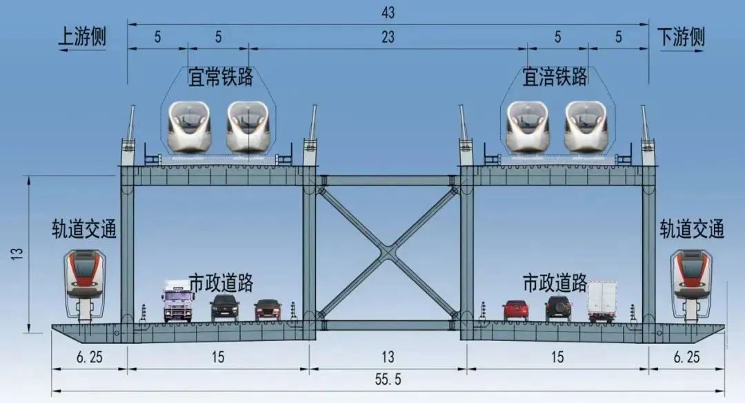 宜涪高铁宜昌长江公铁大桥全长2781.9米,按四线高速铁路+六车道市政道路+两线轨道交通标准设计。