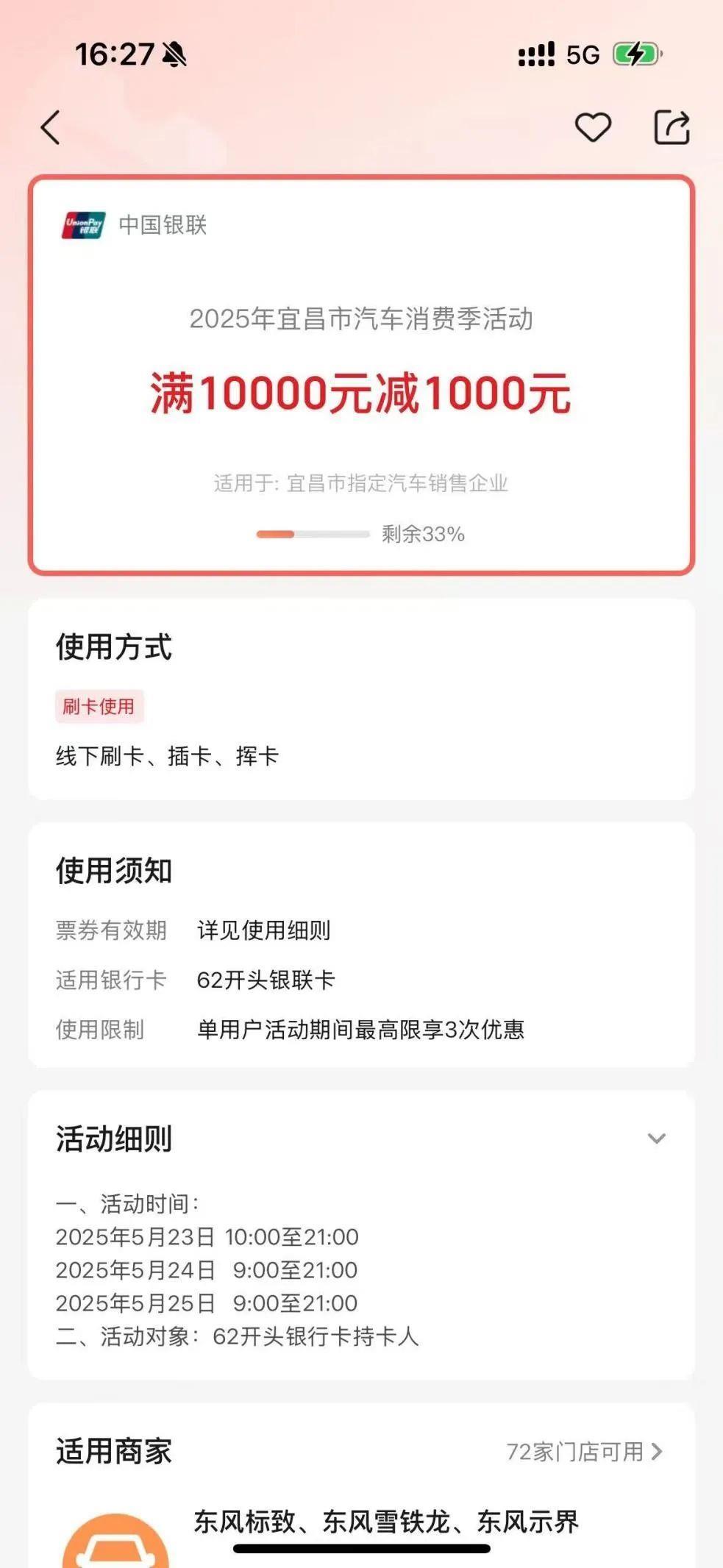 截至开幕式当天16:27,市级汽车购新消费券资金发放平台——中国银联“云闪付”数据显示,“满1万减1千”使用的消费券已达67%。