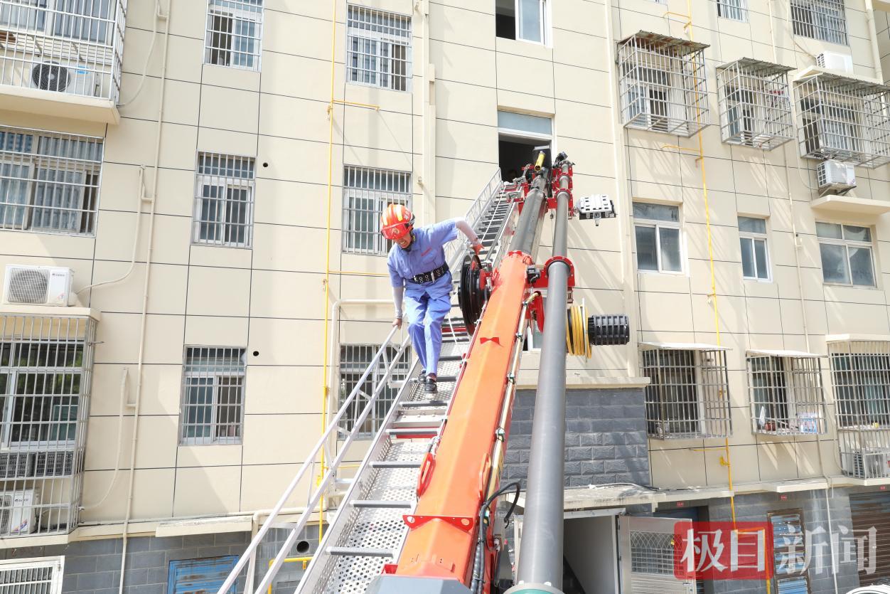 “低头捂鼻,扶稳梯臂!”随着云梯车的轰鸣声响起,银色“手臂”缓缓抬升,在居民楼三楼和地面之间架起一座安全桥梁,现场居民、社区工作人员、物业员工代表在消防员的指导下,成功完成高空疏散。