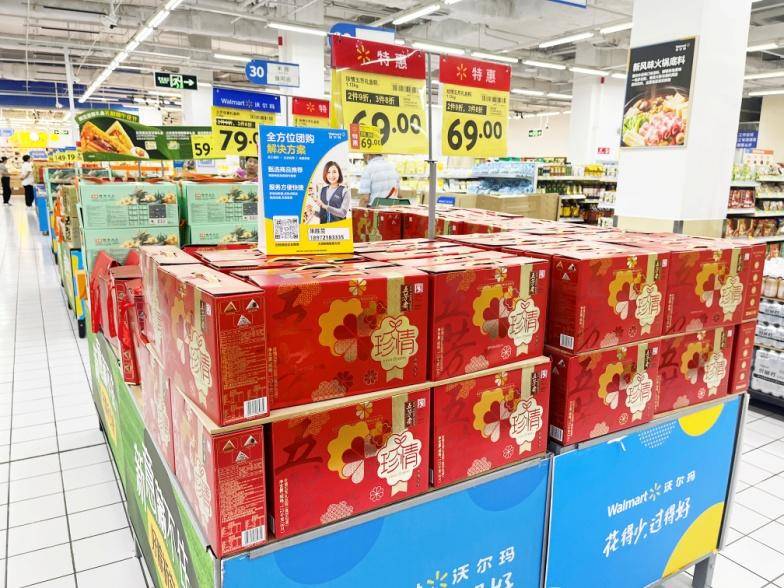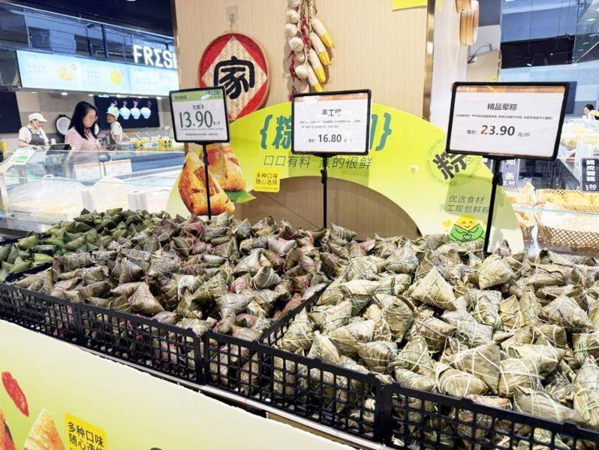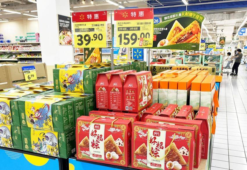 在沃尔玛超市的货架上,形态各异的粽子吸引了不少市民驻足挑选。不仅如此,糯米、鸡蛋、咸鸭蛋等节日商品同样成为热销品。