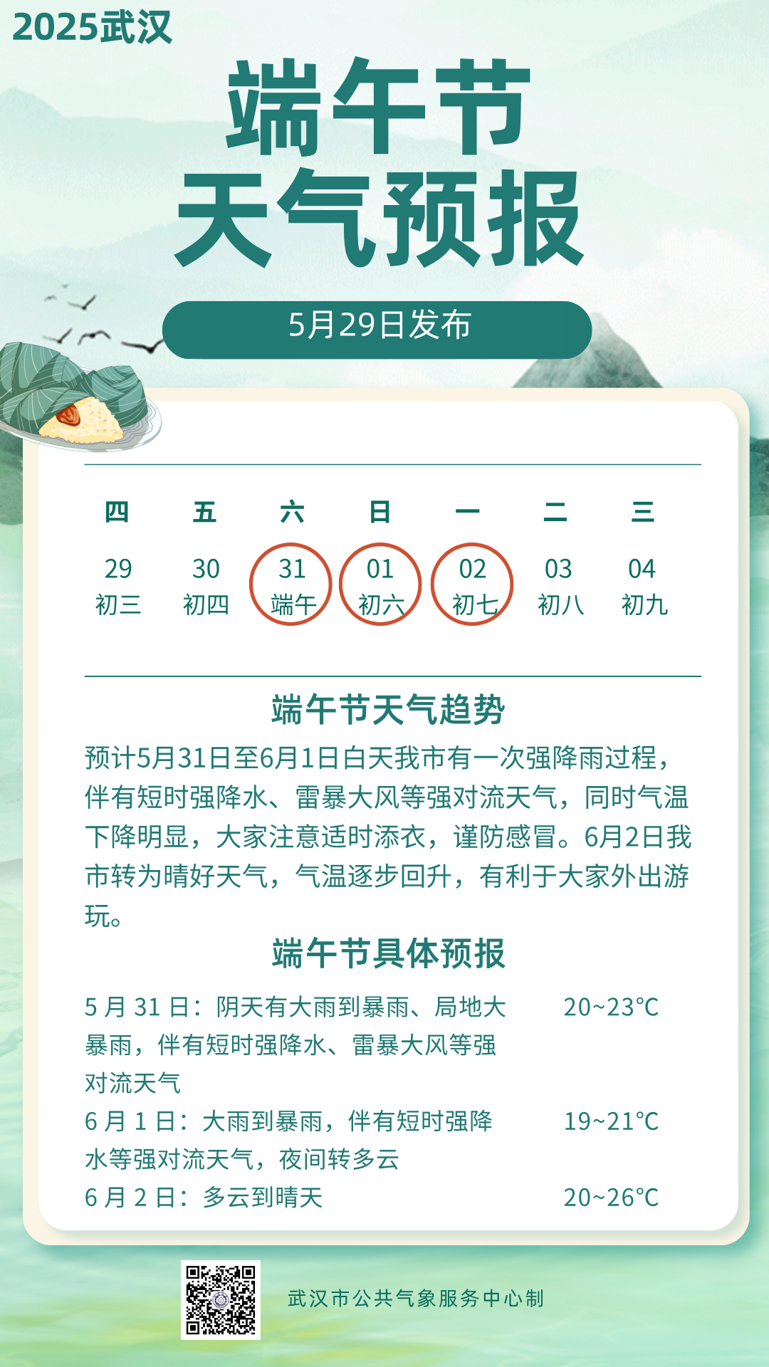 另据武汉气象最新消息,预计5月30日夜间至6月1日白天武汉市有一次强降雨过程,伴有短时强降水、雷暴大风等强对流天气。