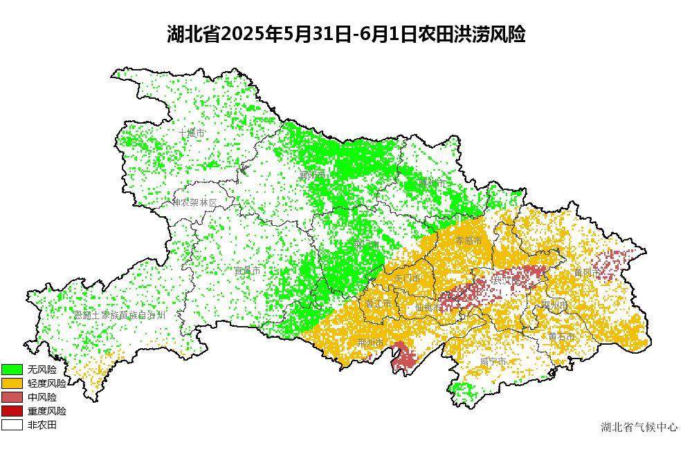 湖北日报讯(记者曾莉)5月30日,湖北省气象局、湖北省农业农村厅联合发布农田洪涝风险预警称,5月31日至6月1日湖北东部农田有渍涝风险,需加强防范。 预计5月30日晚至6月2日白天,湖北有一次较强降雨过程,其中5月30日白天全省多云,鄂西北、鄂西南局地有阵雨或雷阵雨,晚上全省转小到中雨,局地大雨或暴雨伴有雷电;5月31日鄂西南南部、江汉平原、鄂东北、鄂东南阴天有大雨到暴雨,局地大暴雨,并伴有短时强降水、雷暴大风等强对流天气,其他地区阴天有中到大雨;6月1日江汉平原、鄂东南、鄂东北、鄂西南南部阴天有中到大雨,局部暴雨,其余地区阴天有小雨;6月2日鄂西地区西部、江汉平原南部、鄂东南、鄂东北东部阴天有小雨,其余地区阴天转多云。