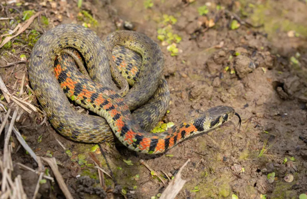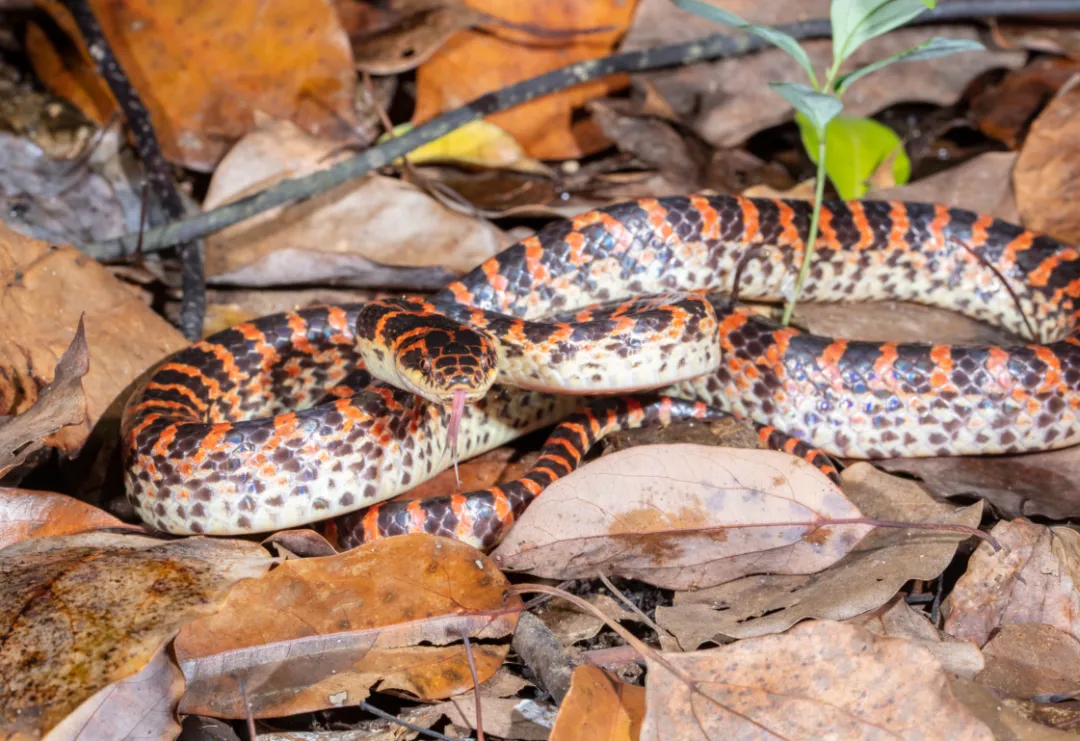 赤链蛇:它会瞬间发火、变脸,头部幻化为三角形,无毒。