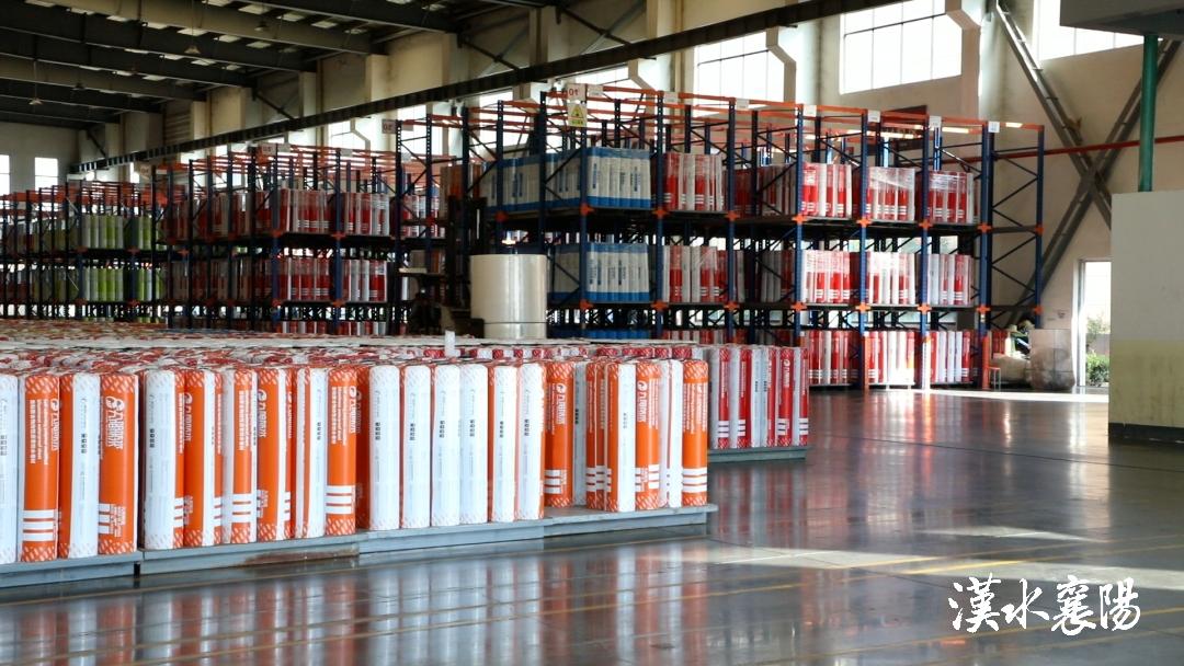 在湖北九阳防水材料科技有限公司生产车间,智能化生产线开足马力生产,高分子自粘胶膜卷材、NSPCX高分子橡胶密封防水涂料等产品接连下线