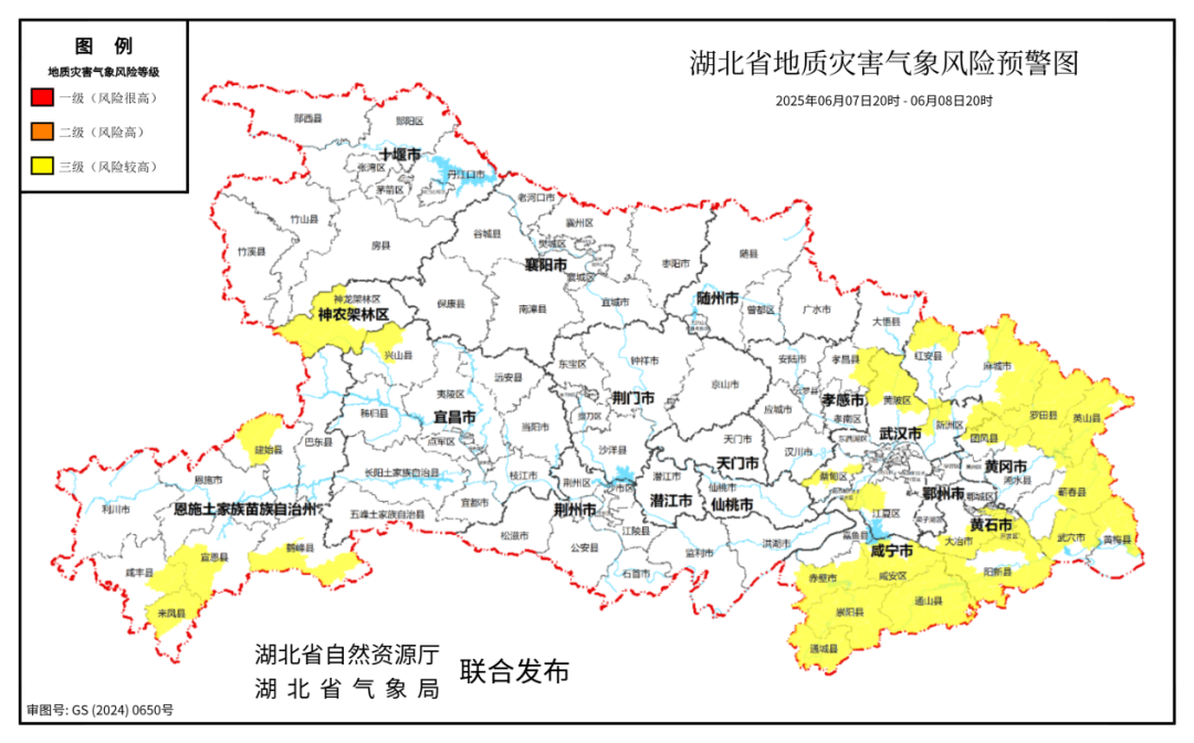 湖北省自然资源厅、湖北省气象局联合发布湖北省地质灾害气象风险预警。2025年06月07日20时-2025年06月08日20时,预计三峡库区(兴山县北部),神农架林区西部和中部,恩施 (建始县北部、咸丰县东部、宣恩县西部、来凤县中部和北部、鹤峰县南部和东部)、孝感(孝昌县东部)、武汉(黄陂区北部和中部、新洲区北部和东部、蔡甸区中部和西部、江夏区西部)、黄石(下陆区、开发区、大冶市南部和东部、阳新县)、咸宁(咸安区、赤壁市、崇阳县、通城县、通山县)、黄冈(红安县北部、麻城市北部和东部、罗田县、英山县、团风县、浠水县北部、蕲春县中部和东部、武穴市、黄梅县北部) 以及其他强降水区域发生崩塌、滑坡、泥石流的风险较高。