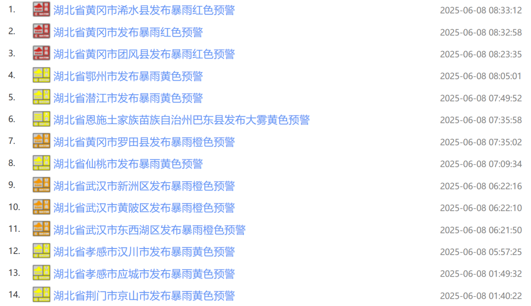 湖北多地发布预警信息
